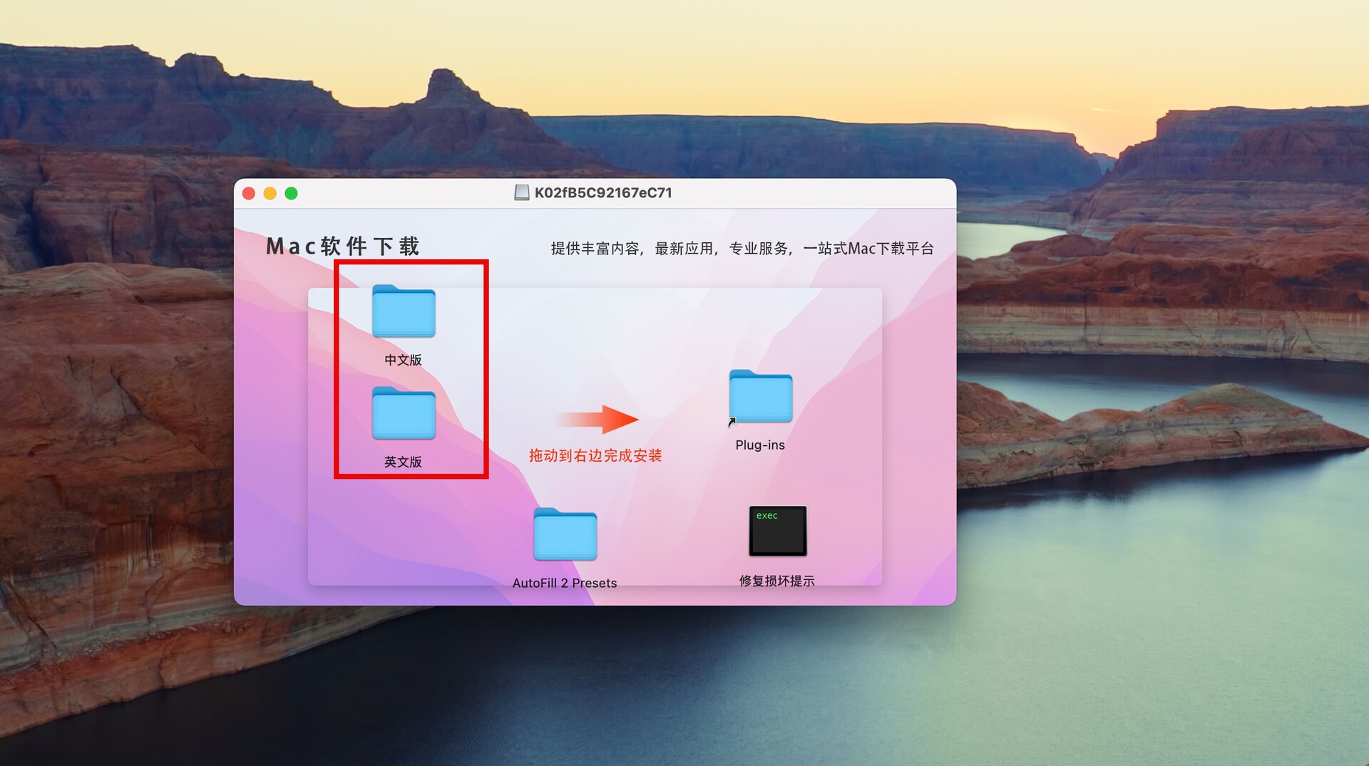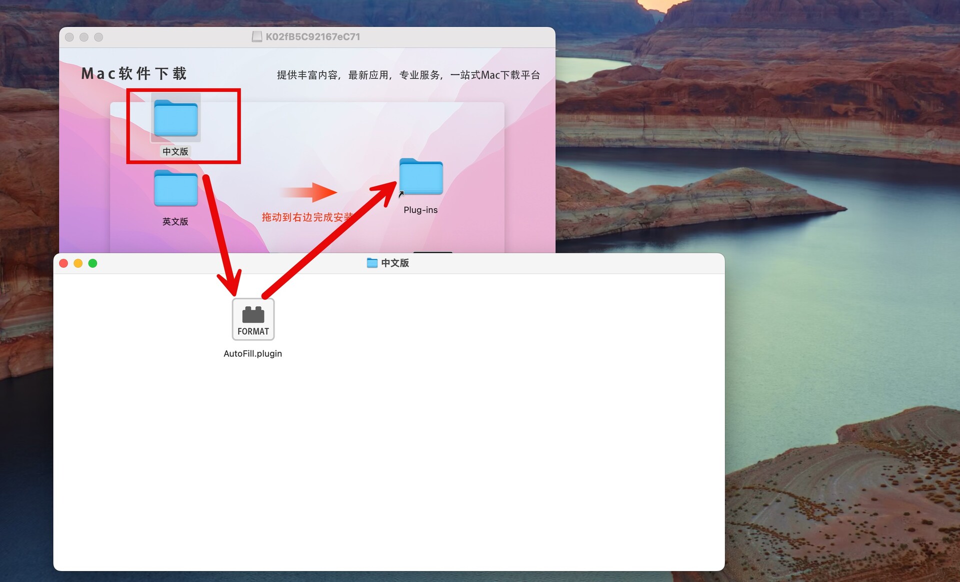 这里以中文版为例,打开中文版文件夹,将AutoFill.plugin拖动到右侧Plug-ins文件中,认证,输入电脑密码即可安装成功。