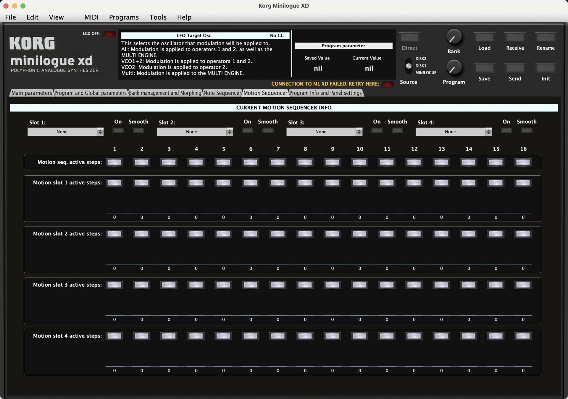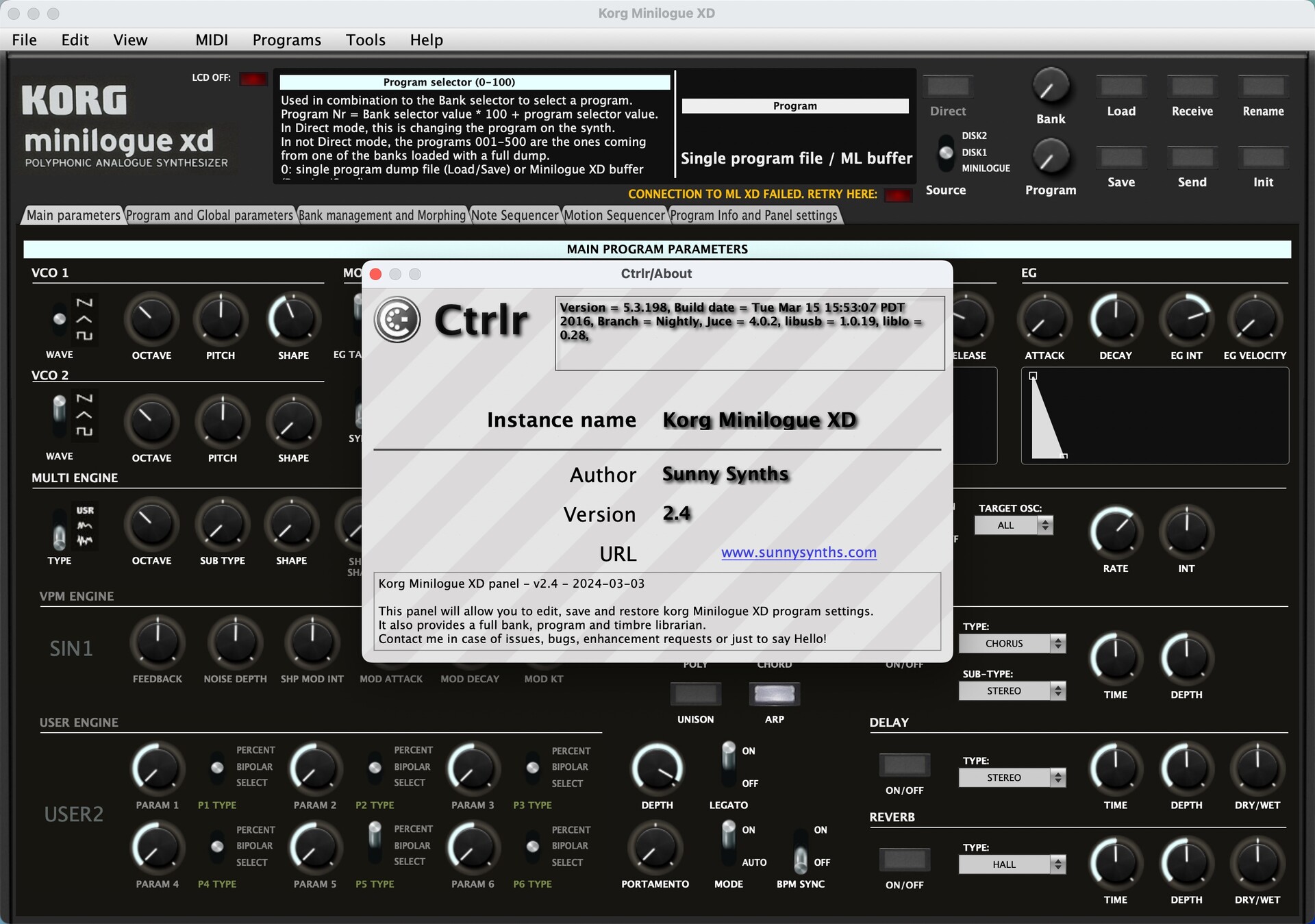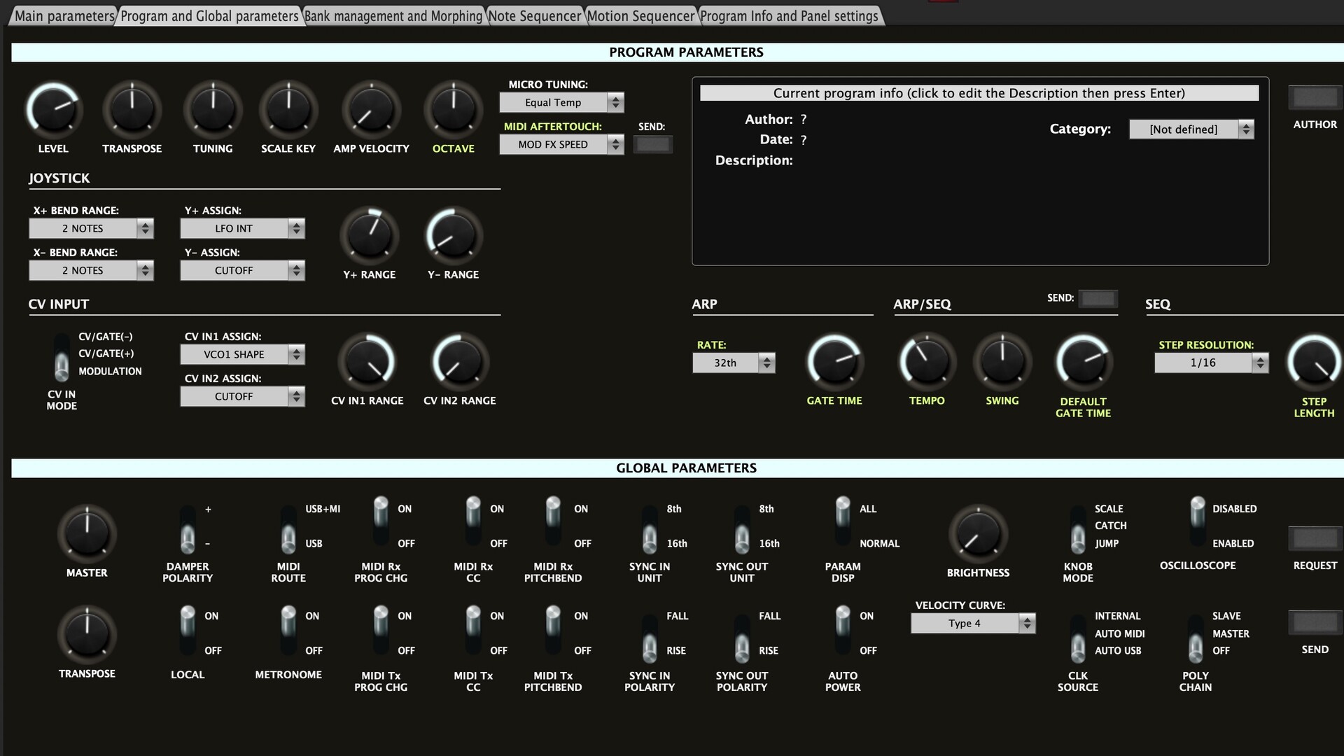 该面板是 Korg Minilogue XD 的编辑器和图书管理员,涵盖程序级别的所有参数。它还处理全局参数,并显示当前程序的序列数据的一些信息(现阶段没有版本)。