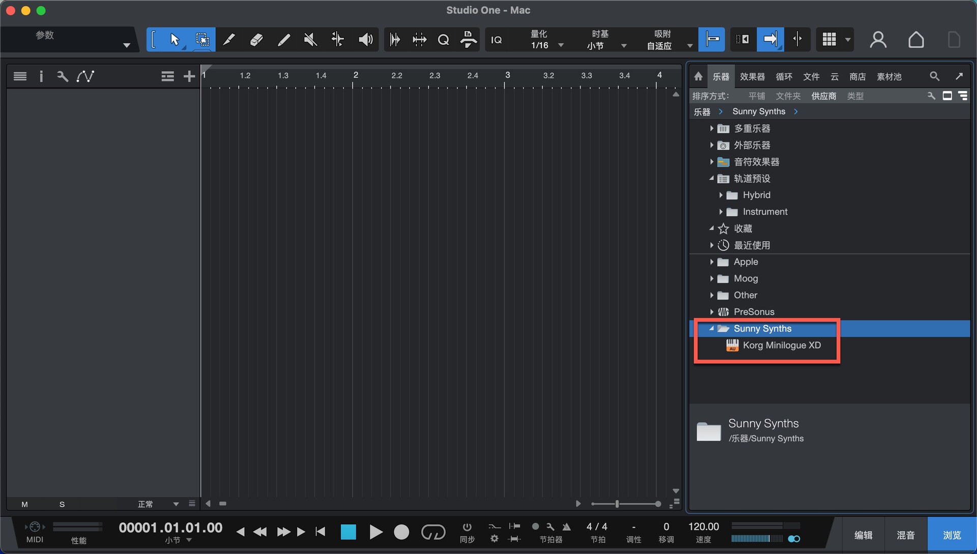 在Studio One乐器-供应商下可找到此插件,拖到中间界面即可