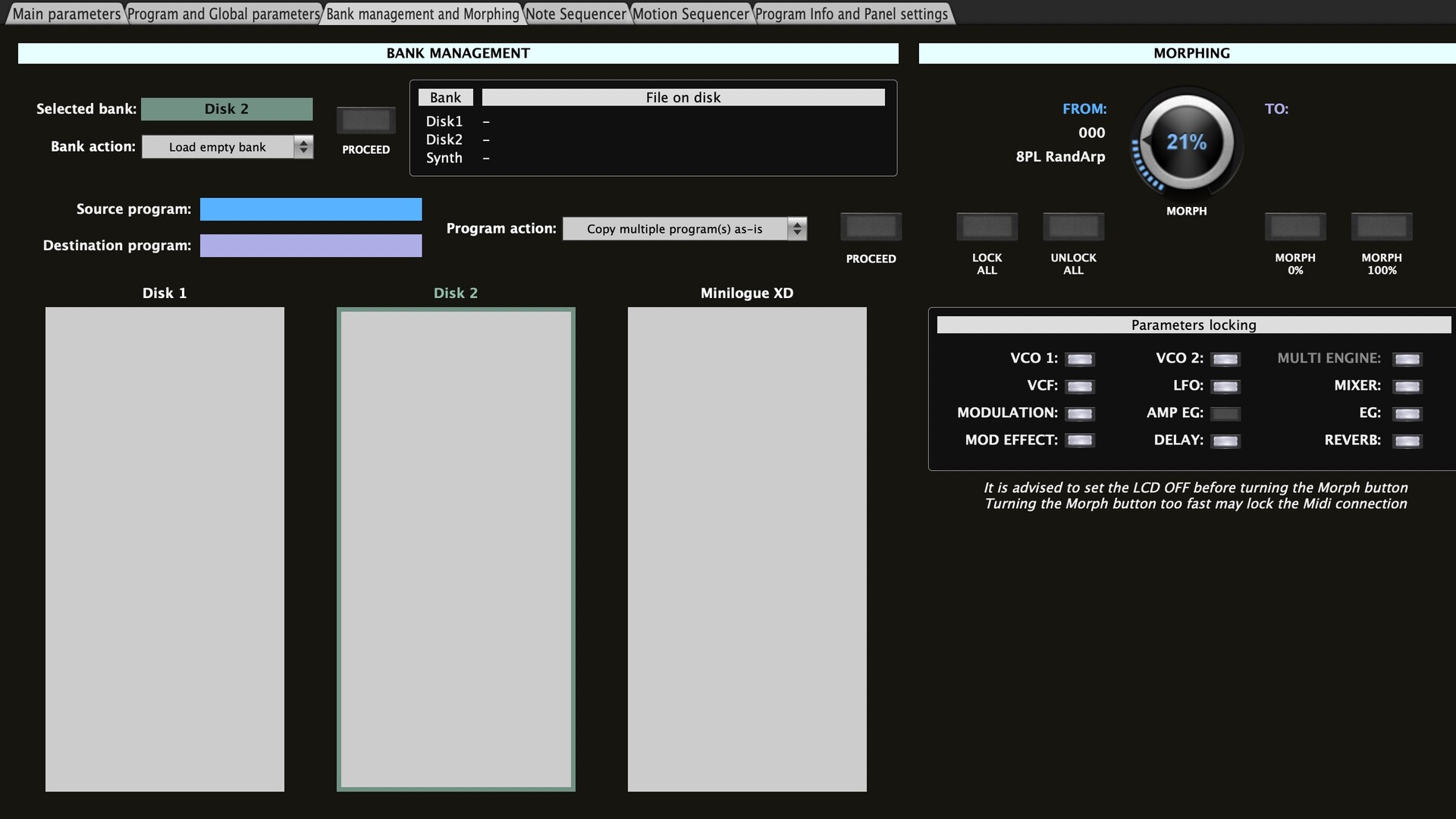 除了编辑器之外,您还将受益于完整的图书管理员。它不仅可以让您管理 Minilogue XD 的内容映像,还可以管理两个仅在您 PC 上的“磁盘”库。从那里,您可以在库之间执行不同的程序操作(复制、交换、初始化和移动),还可以在当前程序和带有参数锁定的目标程序之间执行变形。