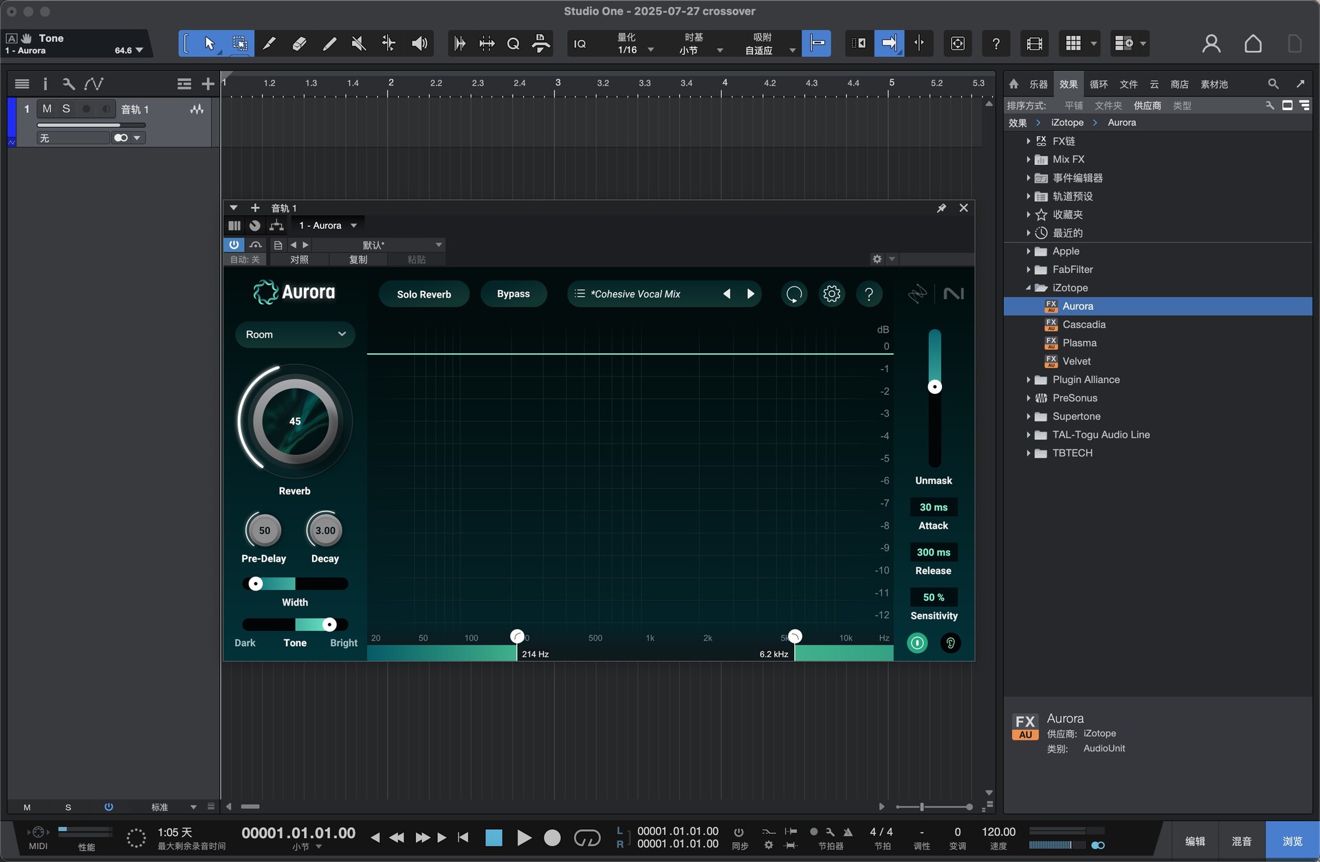 ✓ Aurora 混响插件 Aurora 是一款智能混响器,可带来更纯净的混音。Aurora 凭借其先进的混响引擎和强大的“Unmasking”功能,能够对您的音频做出反应,轻松动态地展现乐器和人声的“Unmasking”,营造出饱满的三维空间感,而不会掩盖音轨。