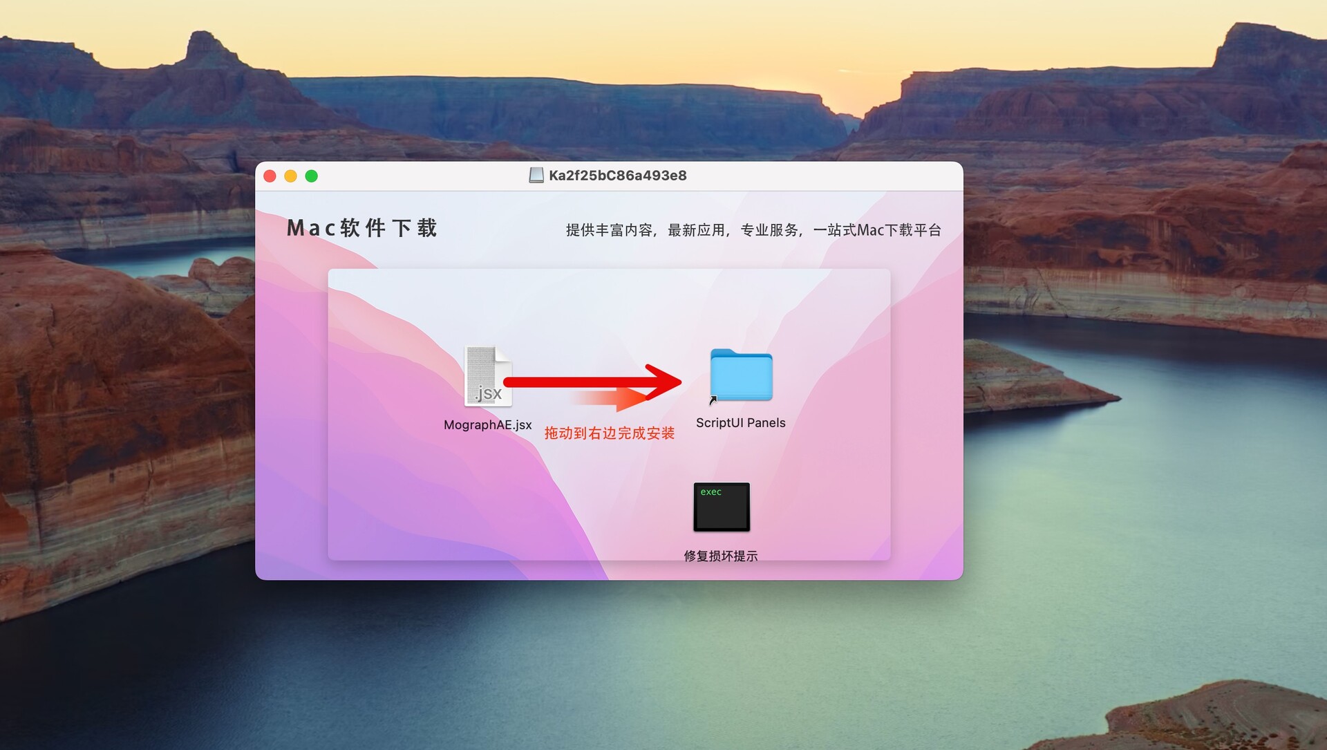 下载安装包后,点击打开镜像包,将左侧的文件拖至右侧【ScriptUI Panels】文件夹中