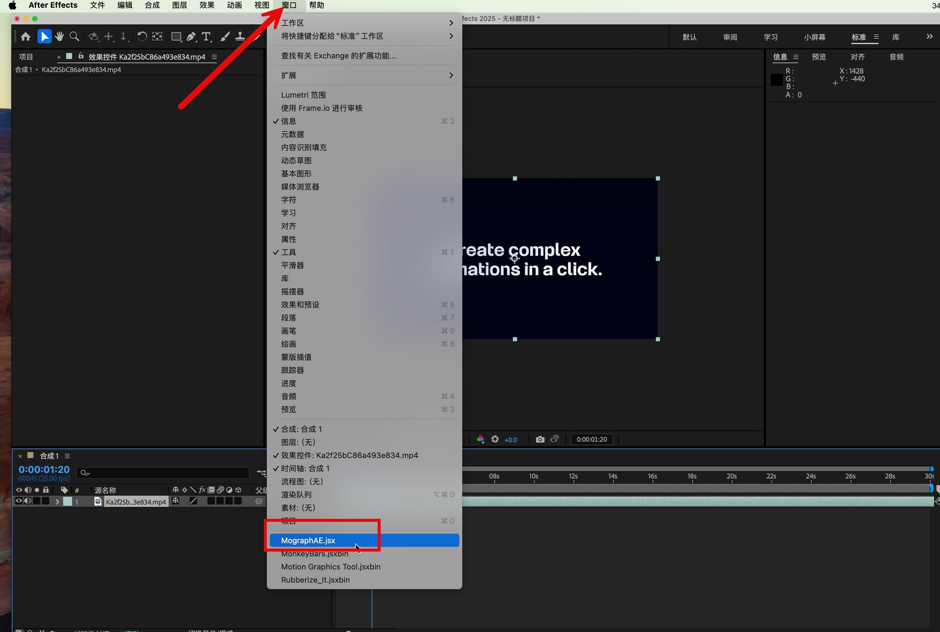 运行ae mac版,在菜单栏的窗口中就能看到安装好的ae脚本了,如下图: