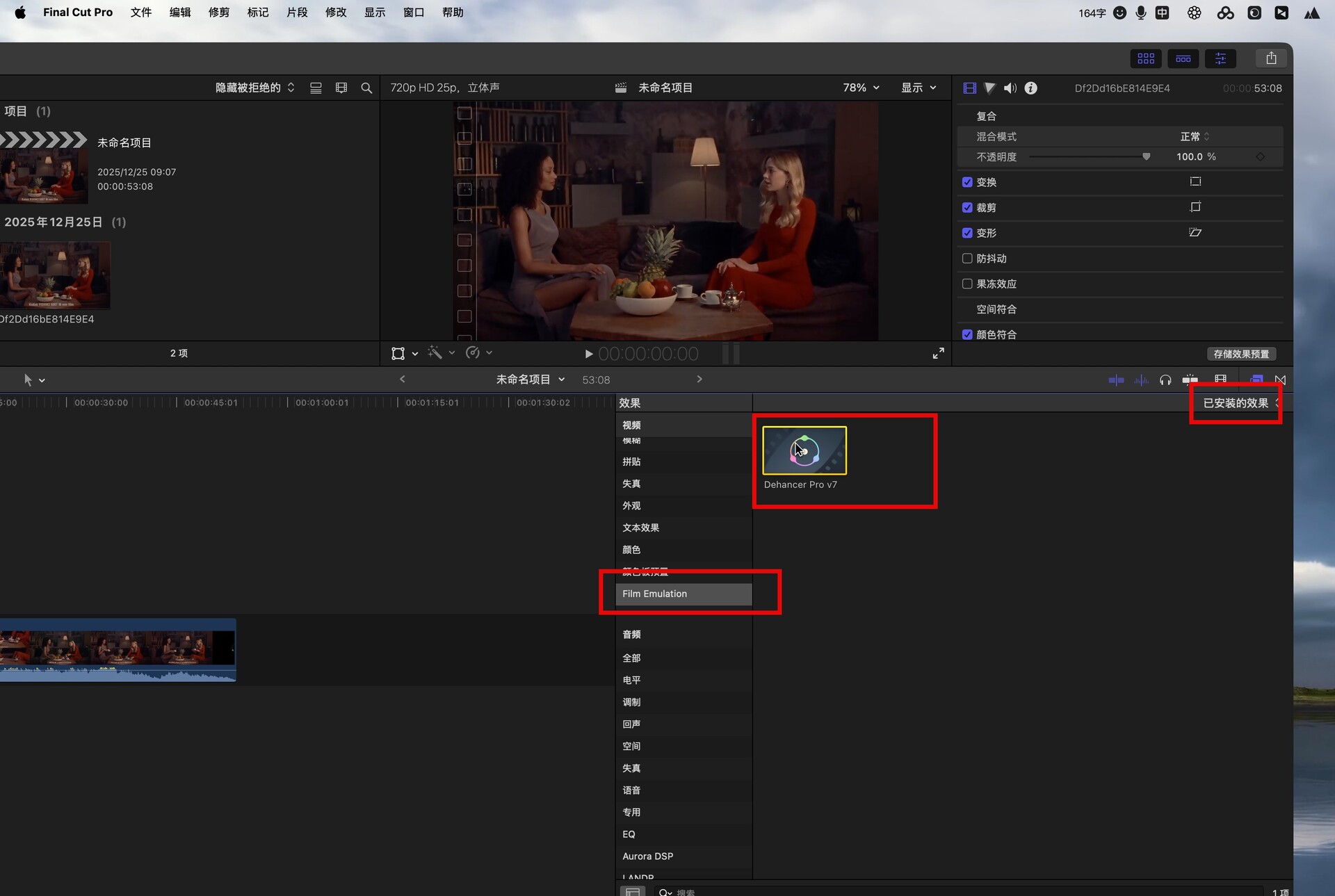 最后打开fcpx软件,在已安装的效果处即可找到安装好的Dehancer Pro 插件,如图