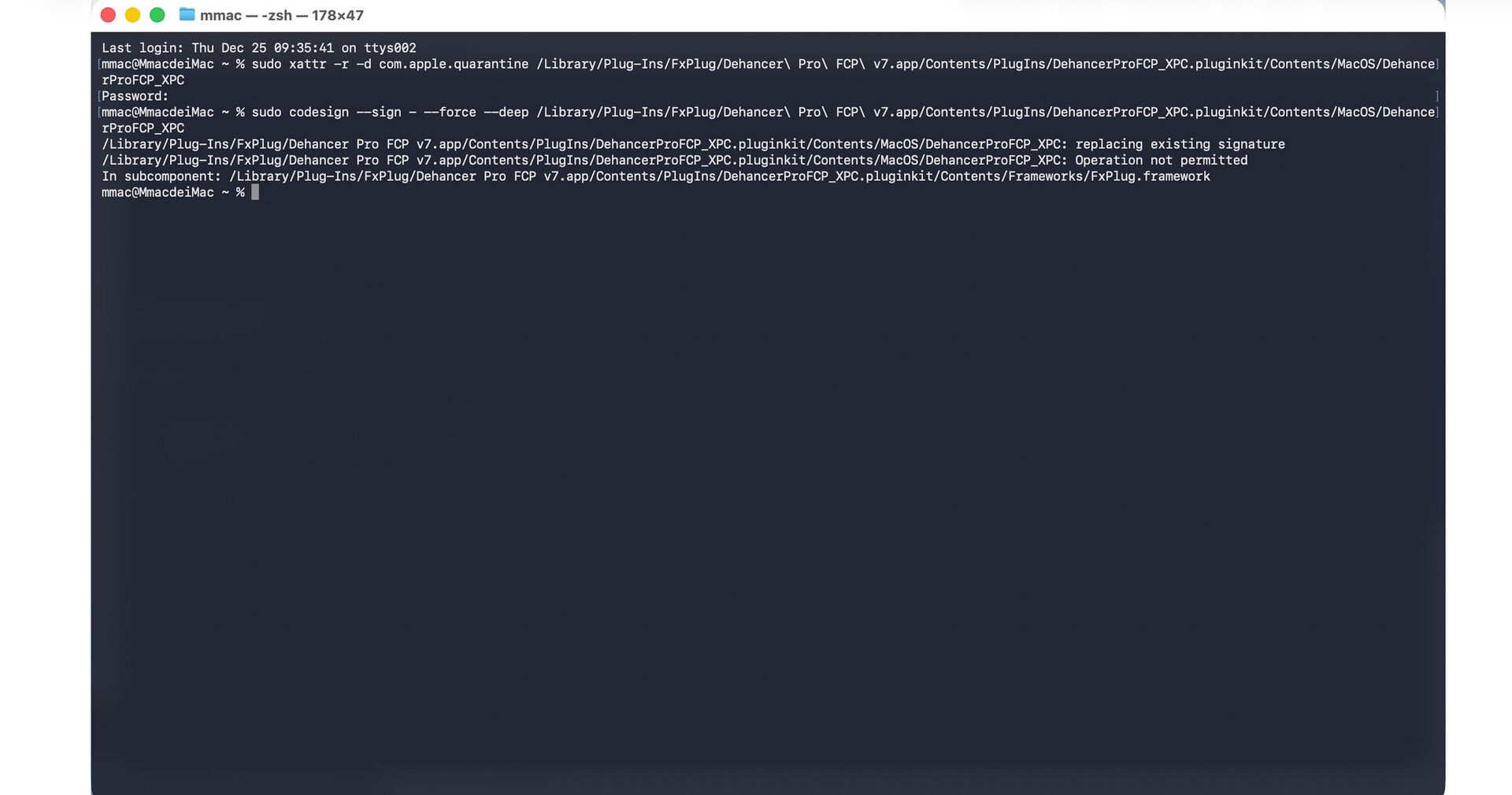 打开终端,在终端输入sudo xattr -r -d com.apple.quarantine 后边加空格,将DehancerProFCP_XPC拖动到命令后边,然后输⼊你开机密码,敲回⻋(输⼊密码的时候不会有任何显示)