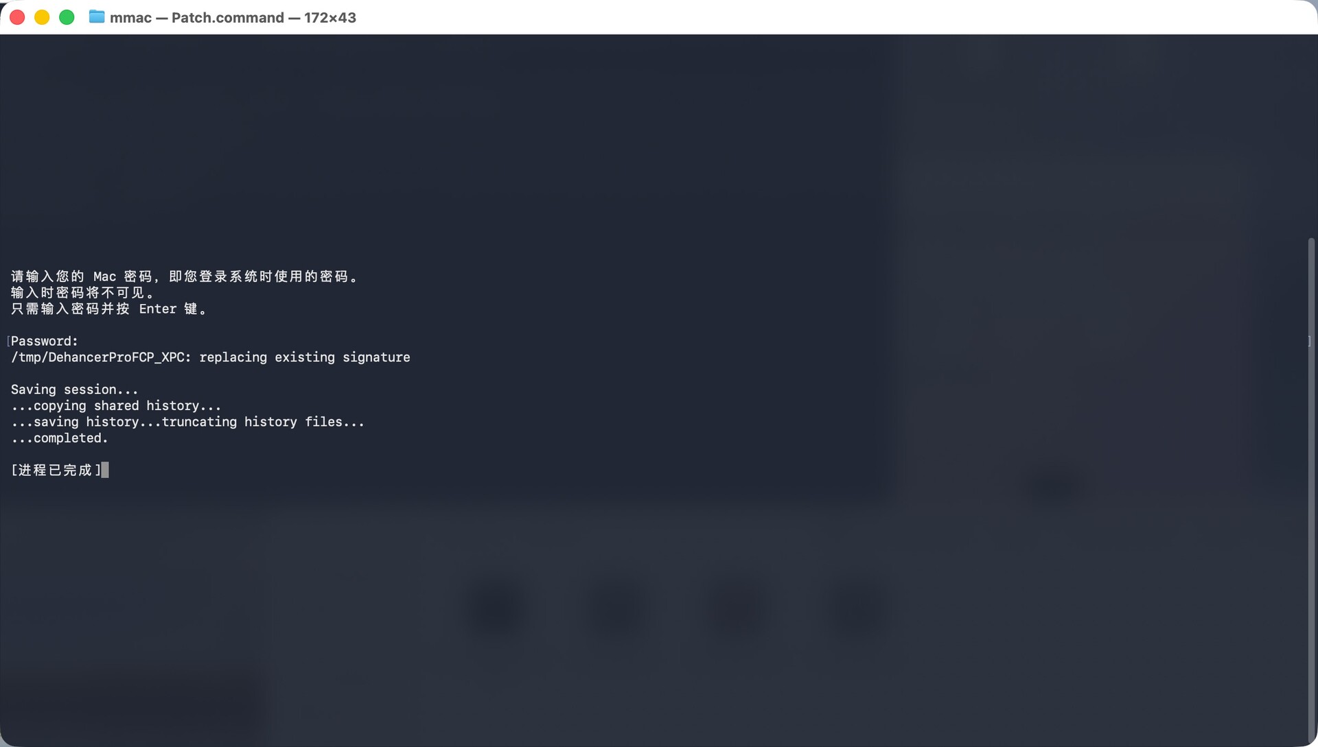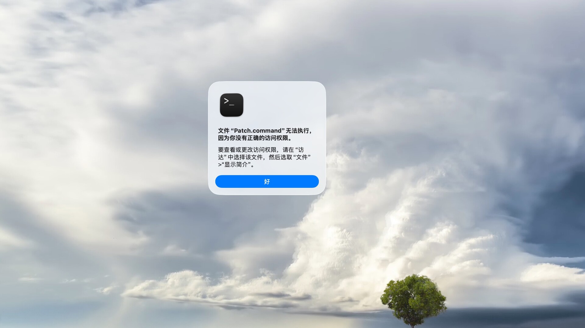 终端运行Patch.command 然后输⼊你开机密码,敲回⻋(输⼊密码的时候不会有任何显示) 如图