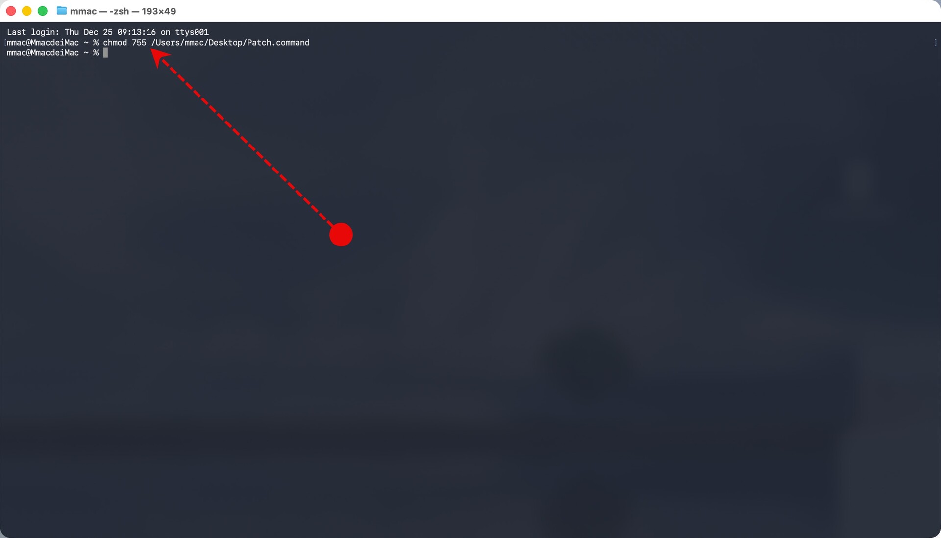 打开终端输入chmod 755 后边加空格,将Patch.command放到空格后边,回车即可,如图