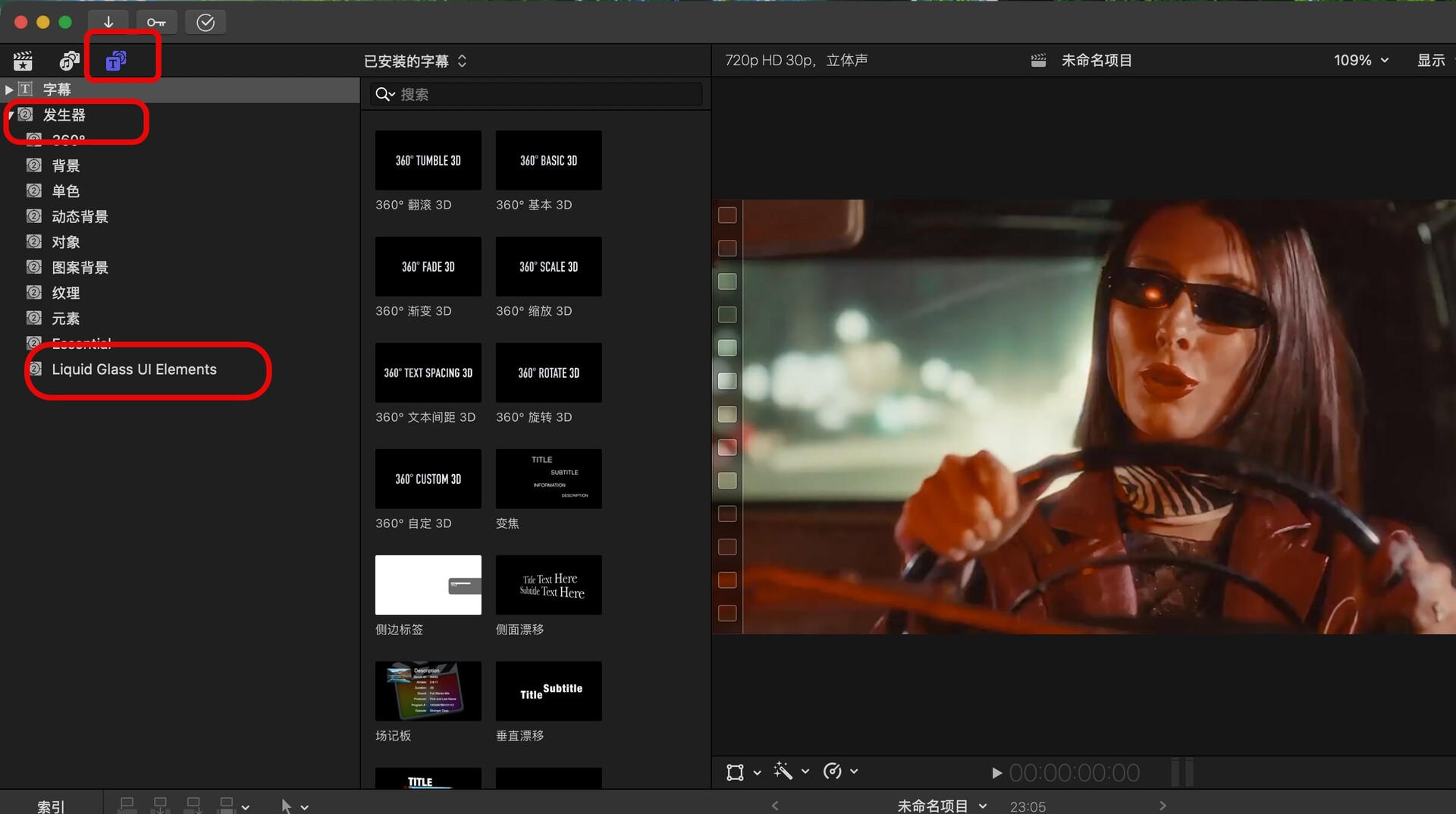 打开fcpx软件,在发生器中,可以看到安装好的fcpx插件Liquid Glass UI Elements