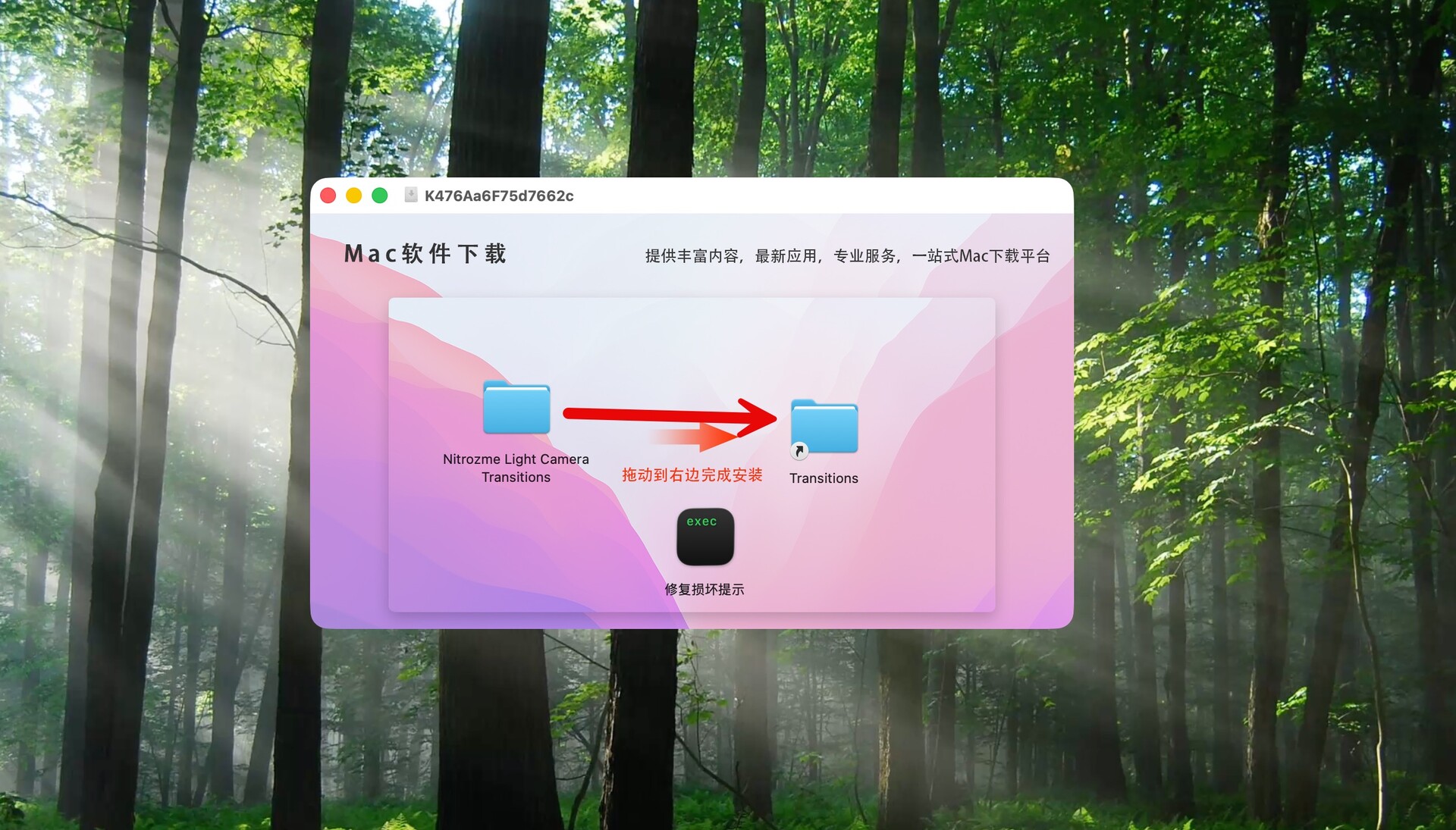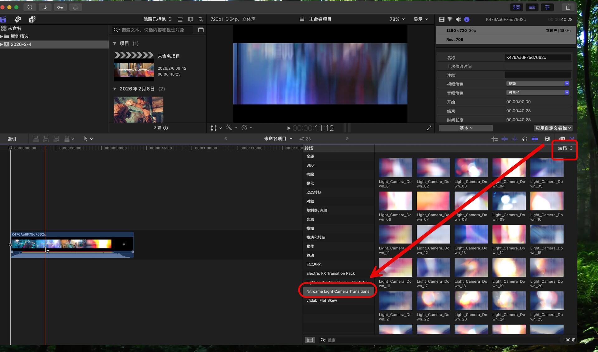 打开fcpx软件,在已安装的转场中,可以看到安装好的fcpx插件Nitrozme Light Camera