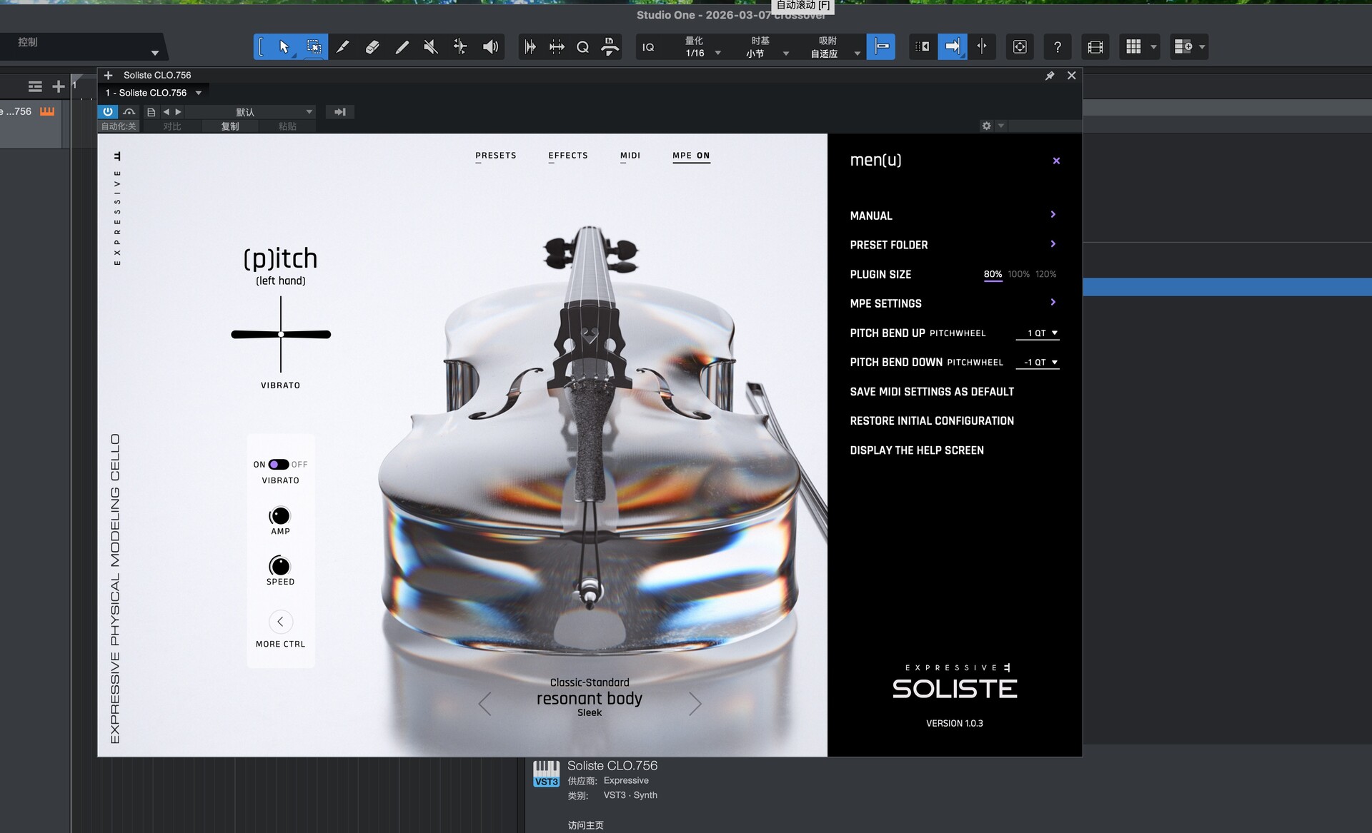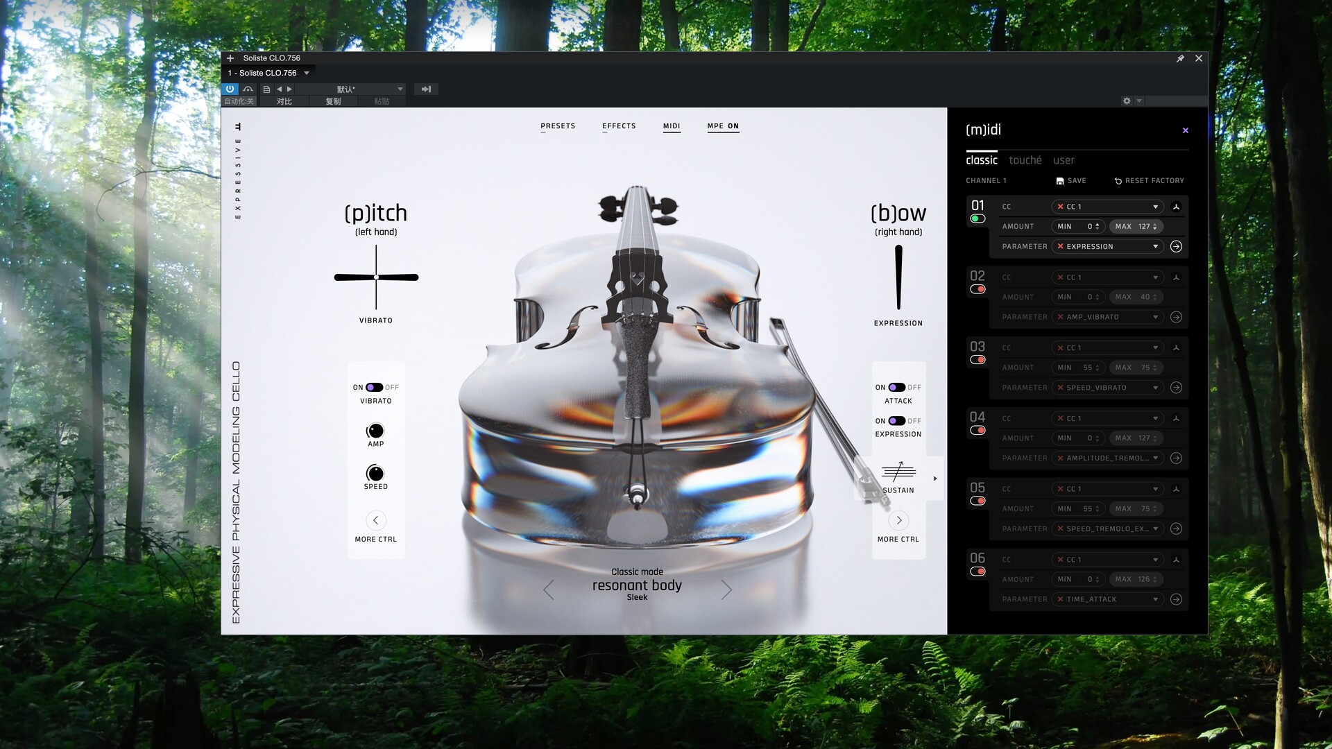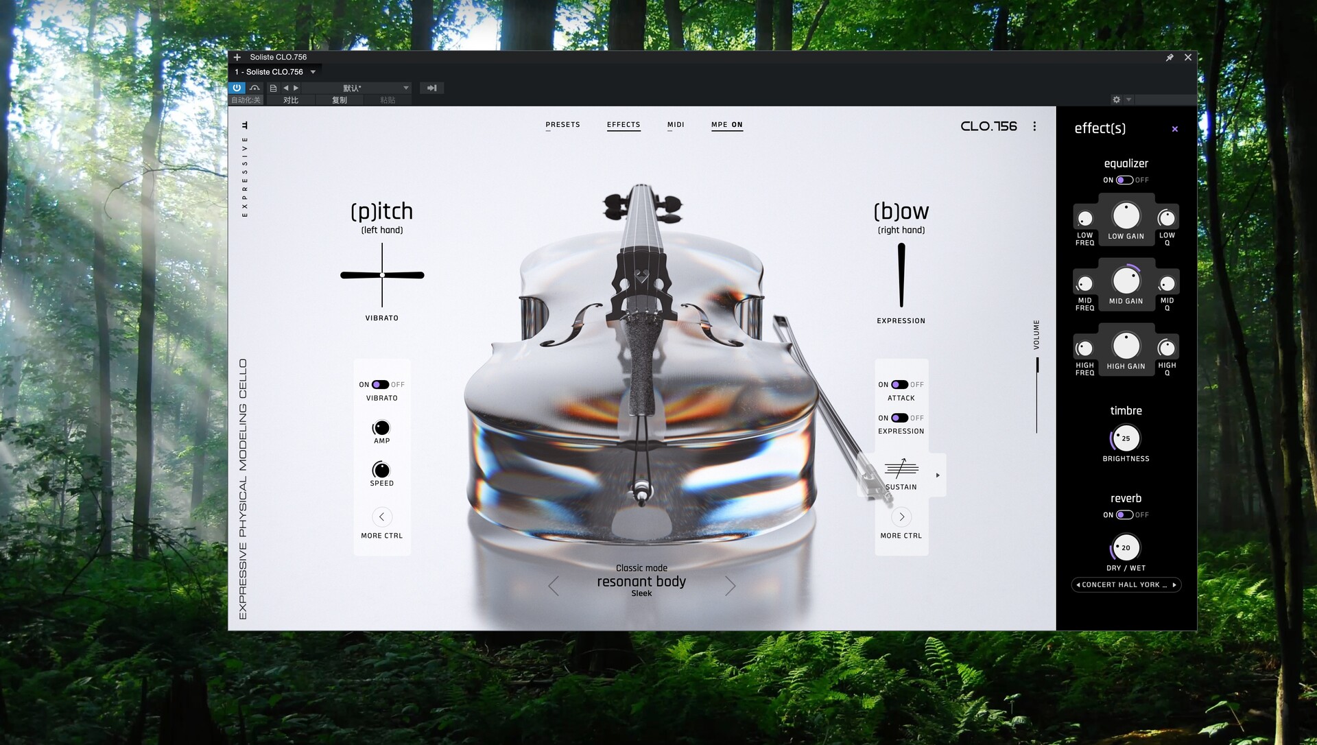 Soliste 是一款独奏弦乐器,它采用物理建模,让您能够用手指真实地拉弓演奏。