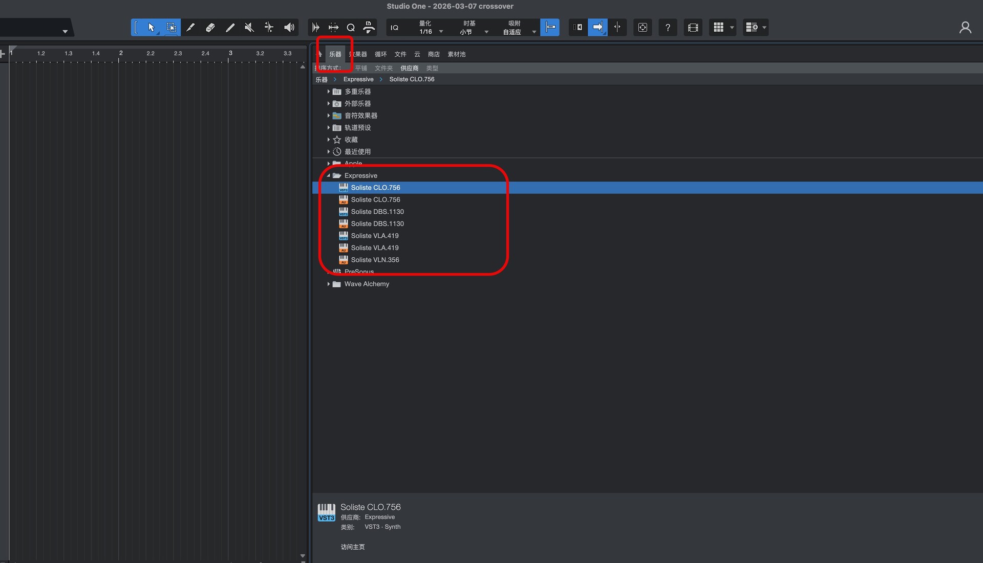 打开studio one 在乐器-供应商中即可找到安装好的插件,如图