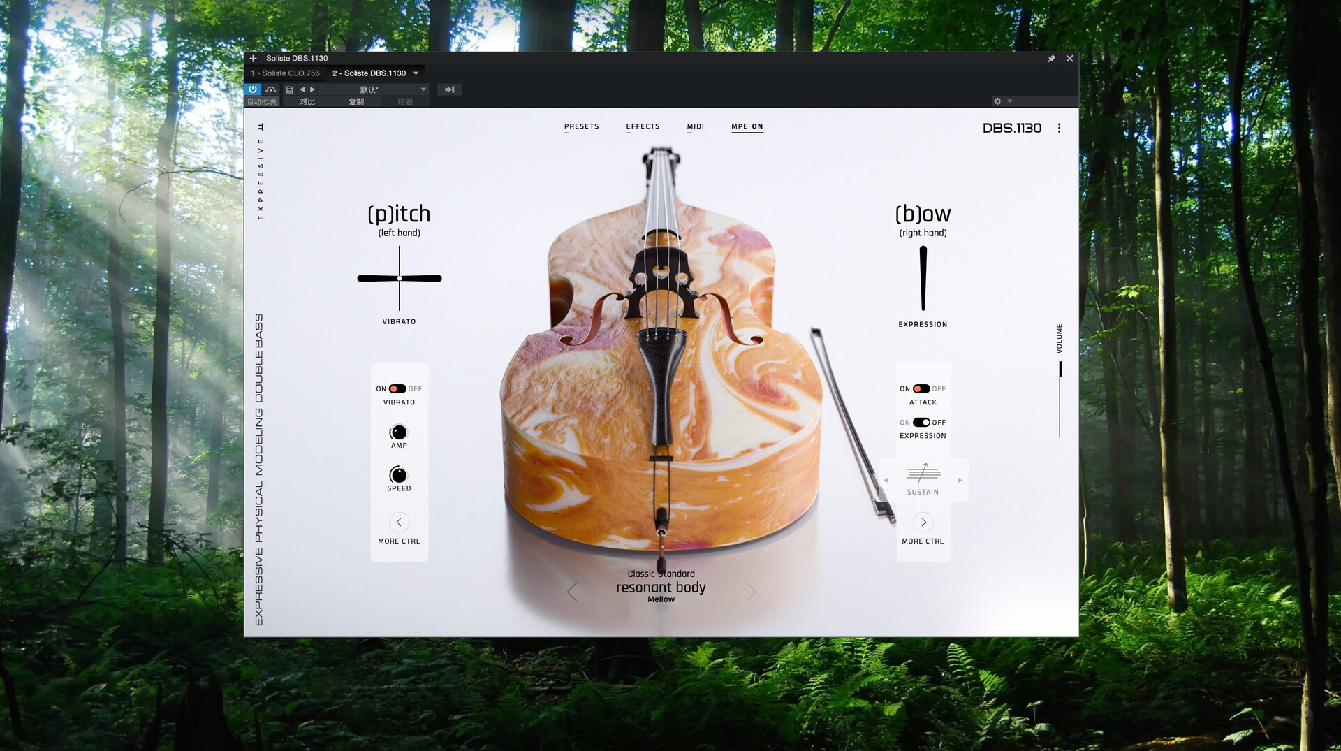 VLN 356(小提琴)、VLA 419(中提琴)、CLO 759(大提琴)和 DBS 1130(低音提琴)等物理建模的独奏弦乐器专为 MPE 和 MIDI 控制器设计,可对发音、弓法、颤音和力度进行直观的实时控制。