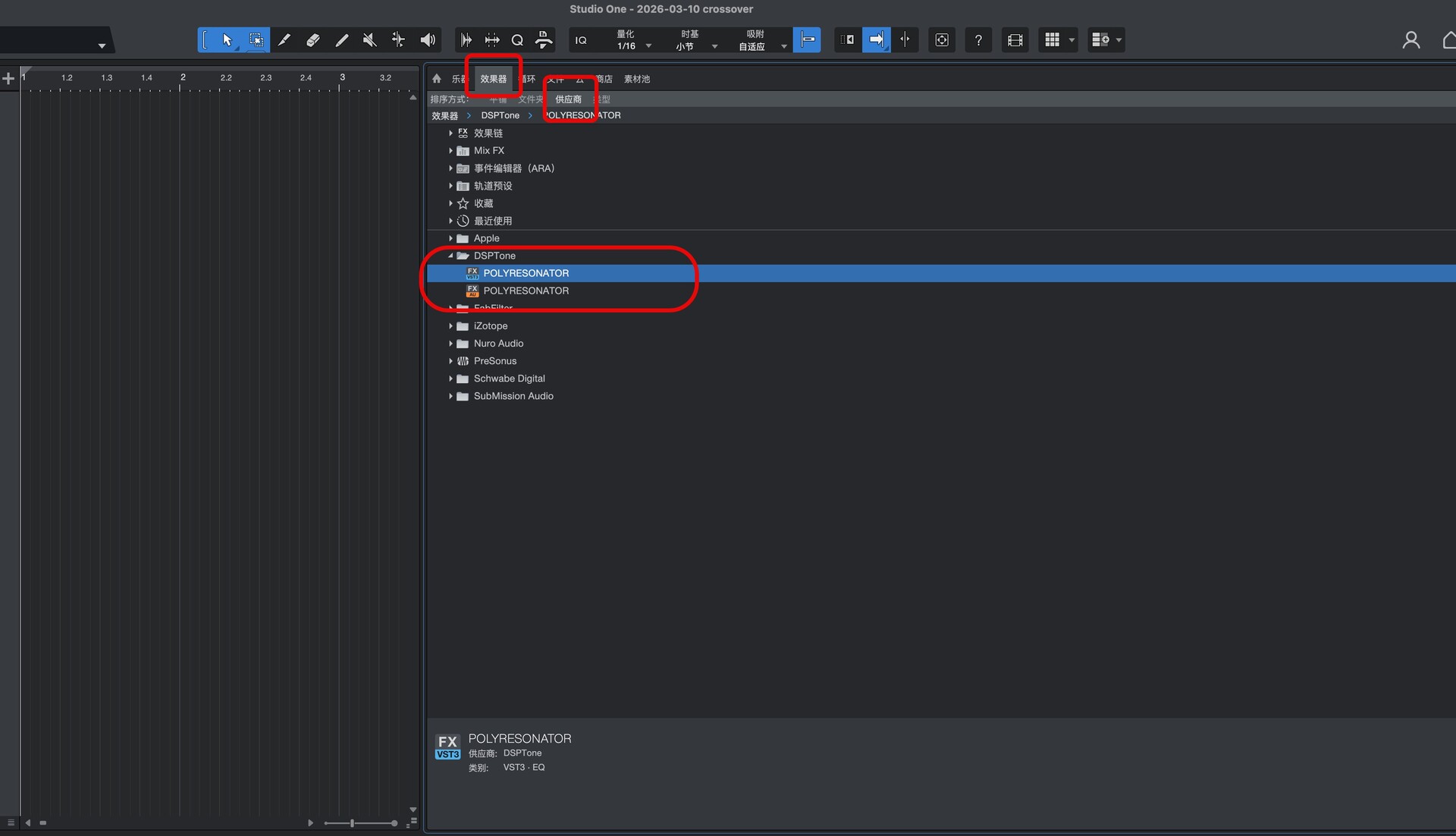 打开studio one 在效果-供应商中即可找到安装好的插件,如图