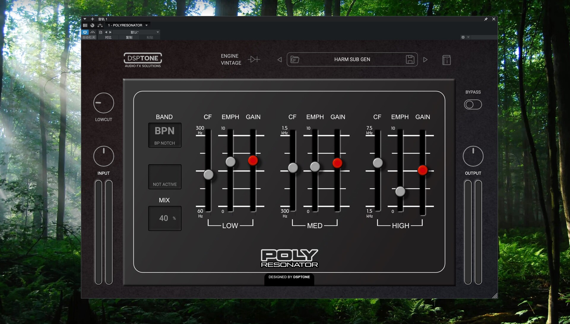 - 在信号进入谐振器频段之前,去除过多的低频成分。这可以提高清晰度,防止低频失真,并使谐振器频段的响应更具音乐性。较低的设置保留了声音的厚重感和饱满度,而较高的设置则强调清晰度和共振峰细节。