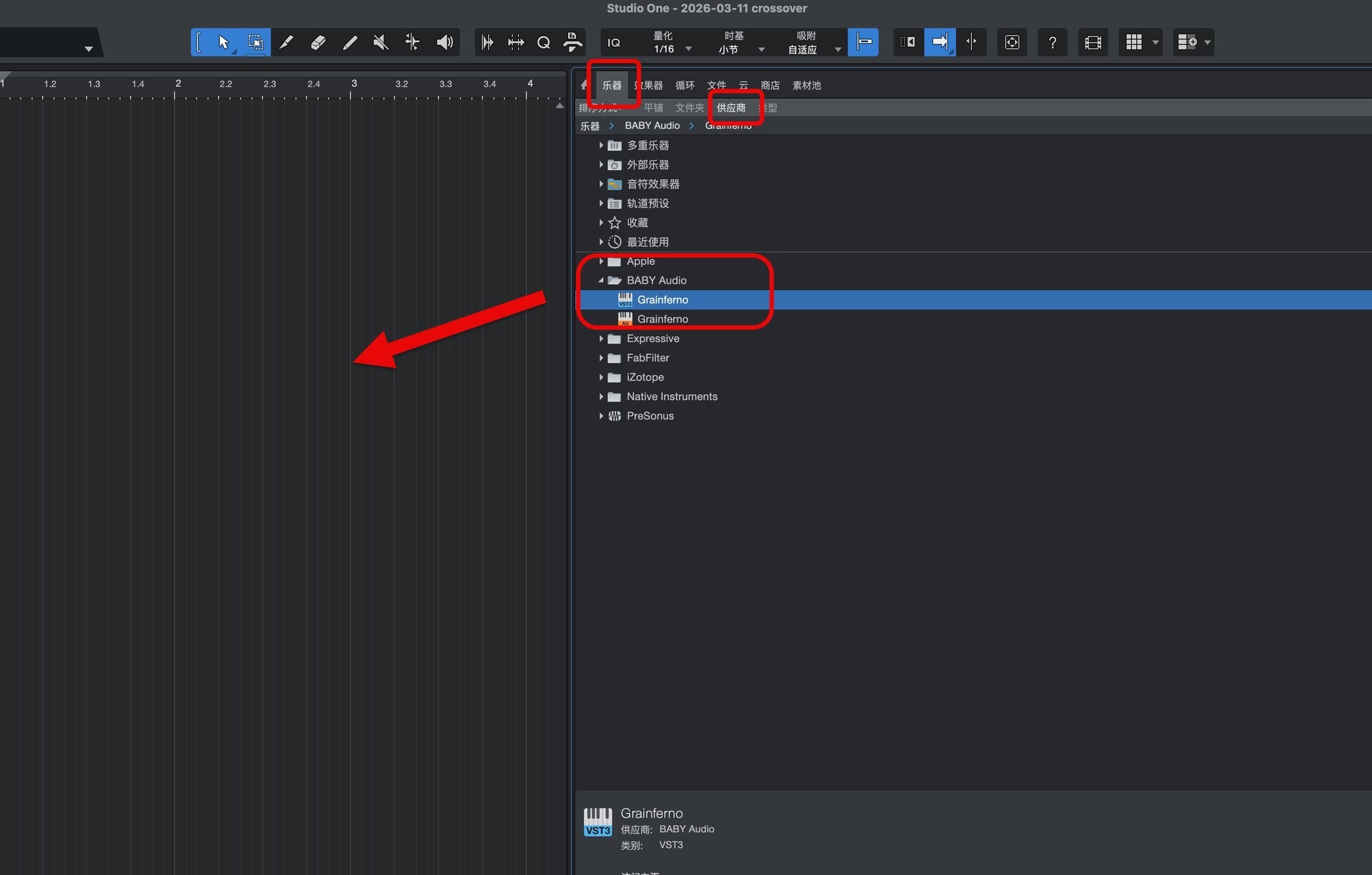 打开studio one 在乐器-供应商中即可找到安装好的插件,如图