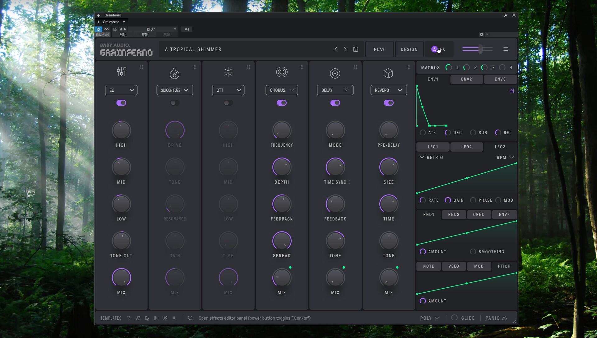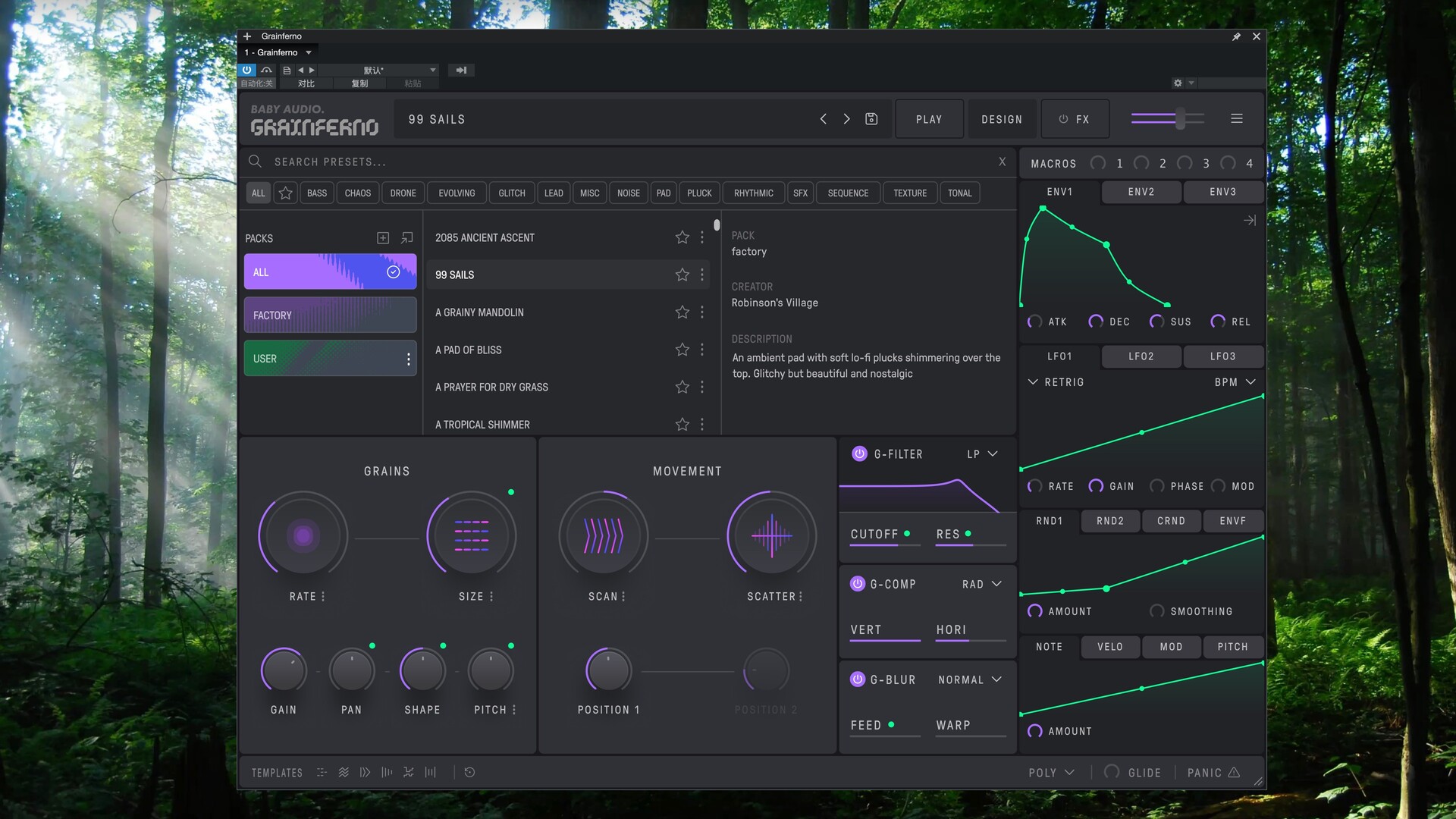 利用 Grainferno 的逐粒效果器,在生成音色时对每粒音色进行精细调整,从而进一步增强、扰乱和改变最终效果。非常适合用于混合乐器、营造迷幻氛围的持续音以及创造传统合成器无法企及的音色。
