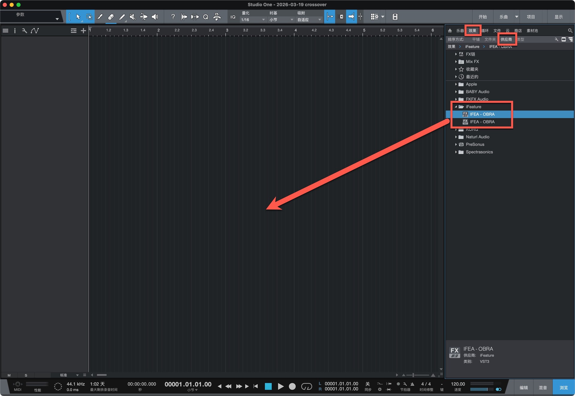 打开studio one软件,在效果-供应商中即可找打安装好的插件,拖动到左侧空白处即可使用