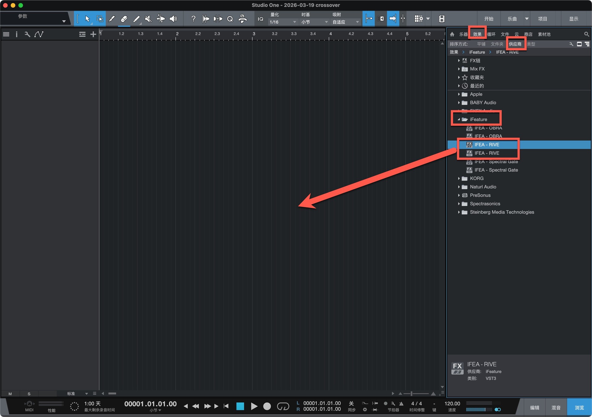 打开studio one软件,在效果-供应商中即可找打安装好的插件,拖动到左侧空白处即可使用