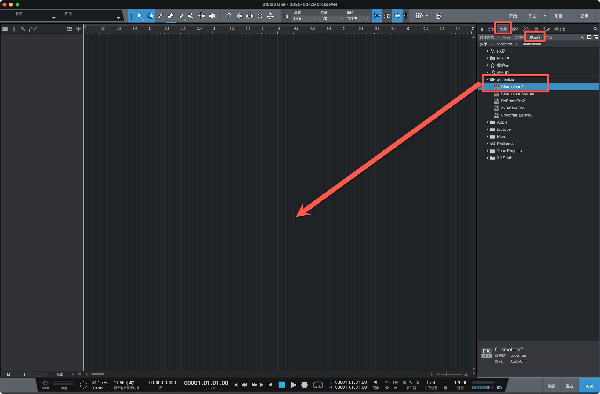 打开studio one软件,在效果-供应商中即可找打安装好的插件,拖动到左侧空白处即可使用