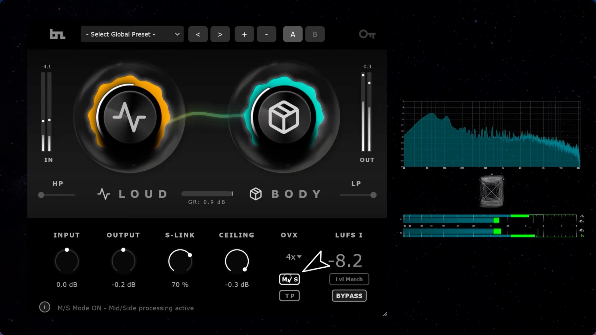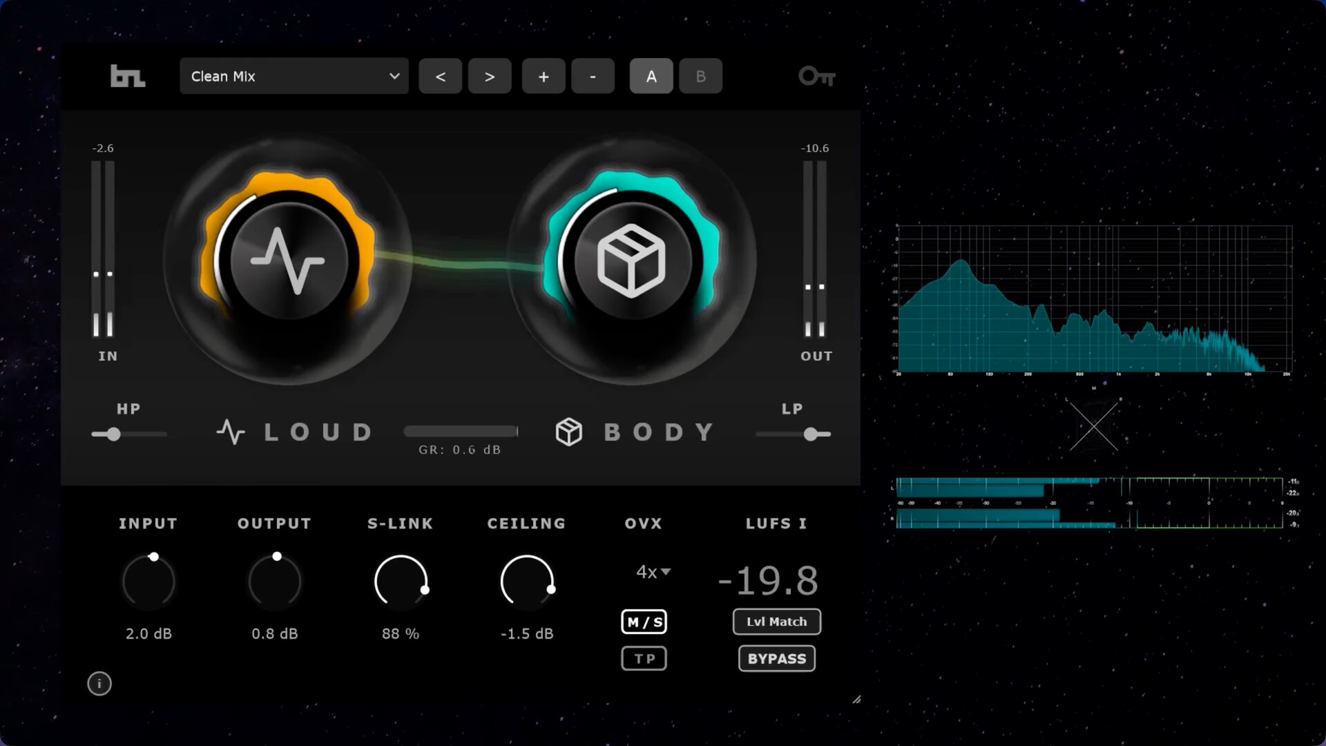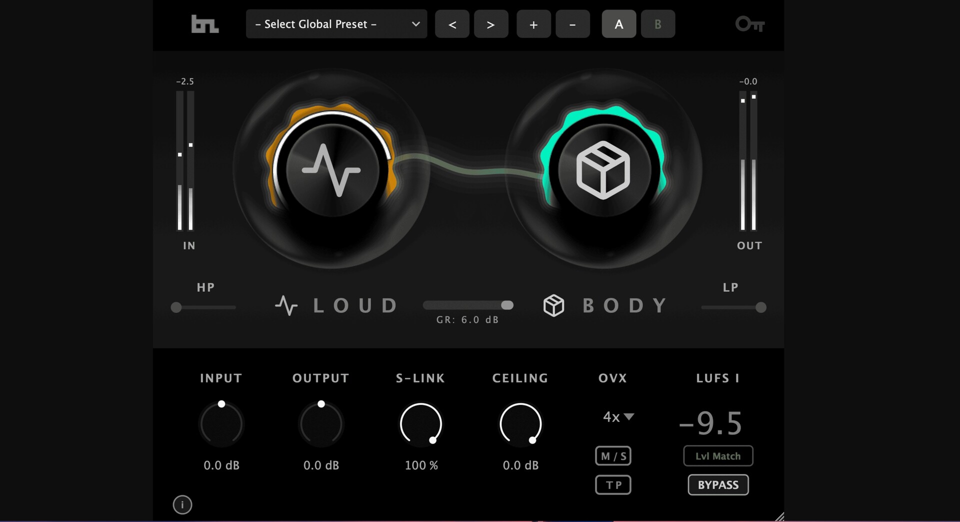- LoudBody 的专业 LUFS 电平表和精确的上限控制功能,让您轻松为任何流媒体平台制作完美的母带。只需使用实时 LUFS-I 显示屏设定目标响度,设置上限以防止编解码器失真,然后导出即可。