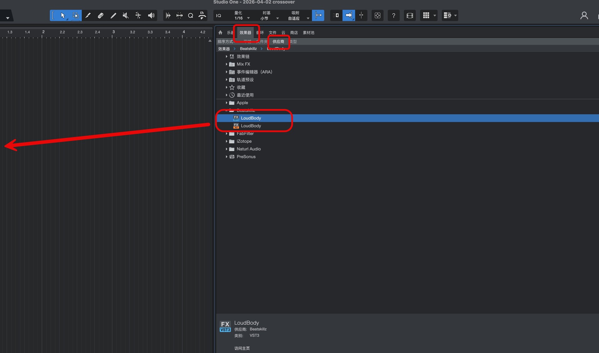 打开studio one 在效果-供应商中即可找到安装好的插件,拖动到左侧音轨处即可,如图