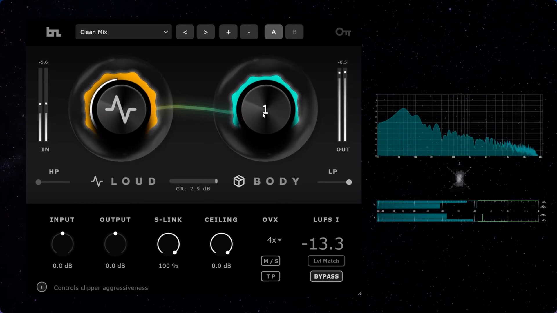 - 分别处理中置声道和侧置声道。在实现最大响度的同时,保持立体声像的完整性——即使在高音量下,混音依然保持三维立体感。