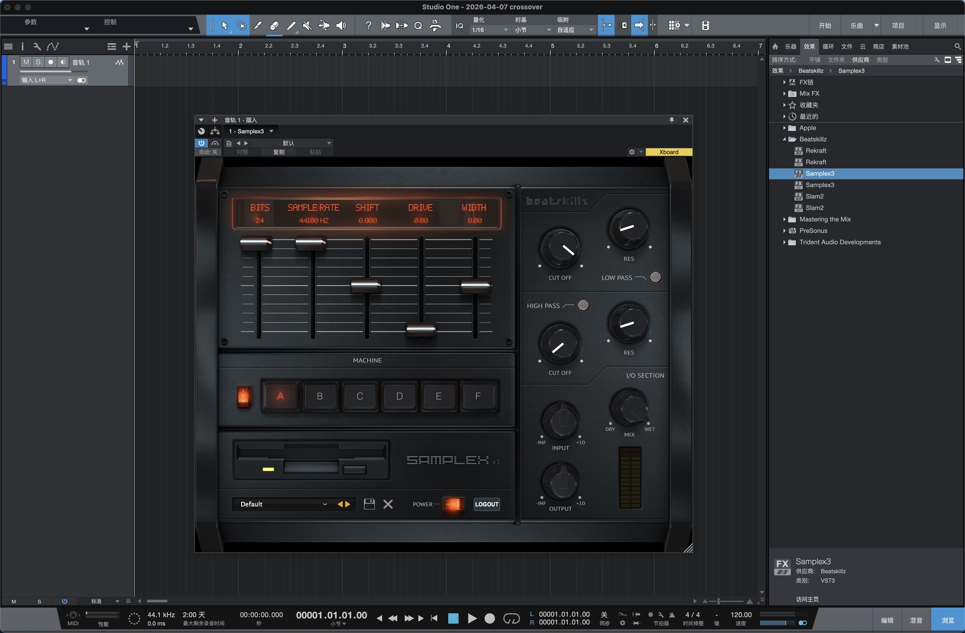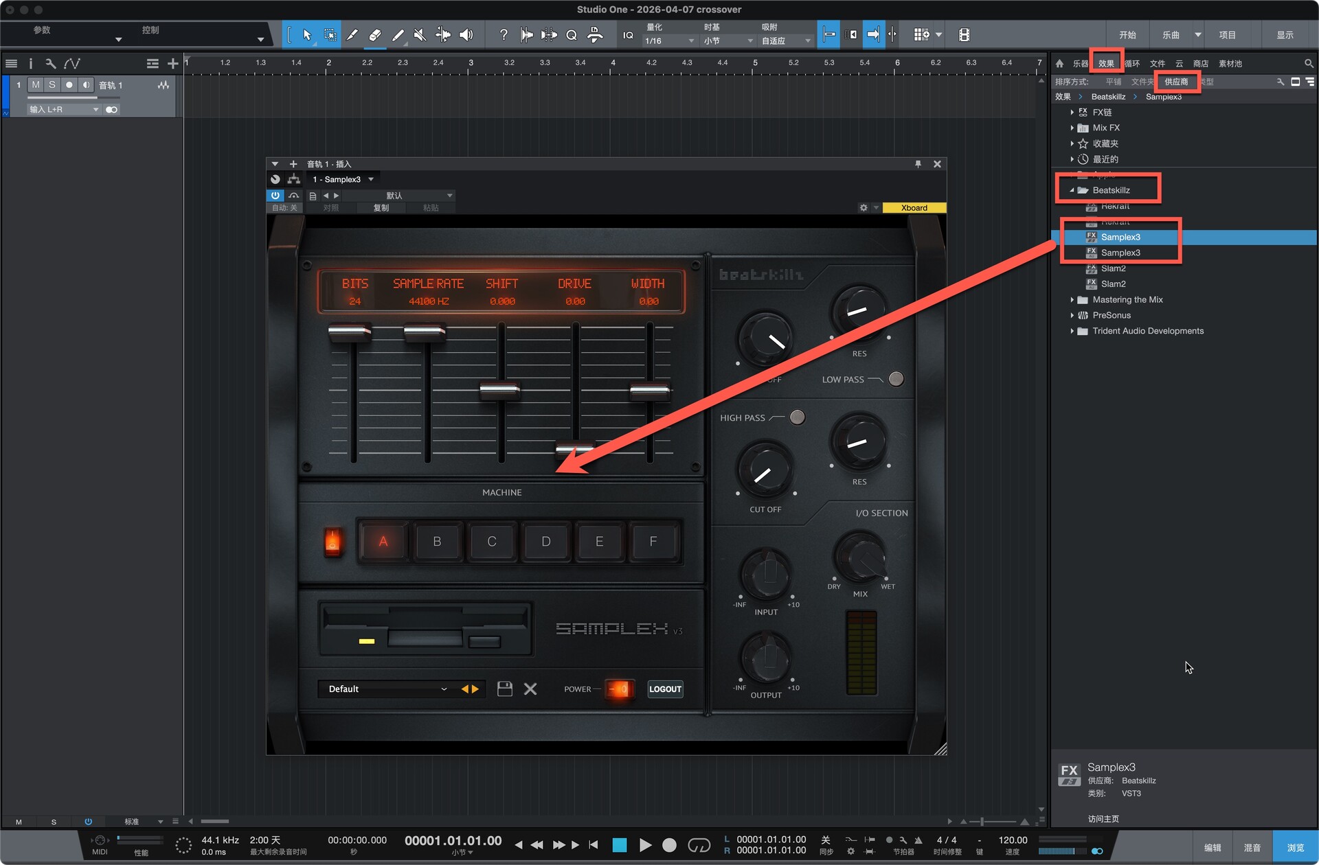 打开Studio One,在效果——供应商中找到安装好的SampleX3,拖动到软件空白处运行