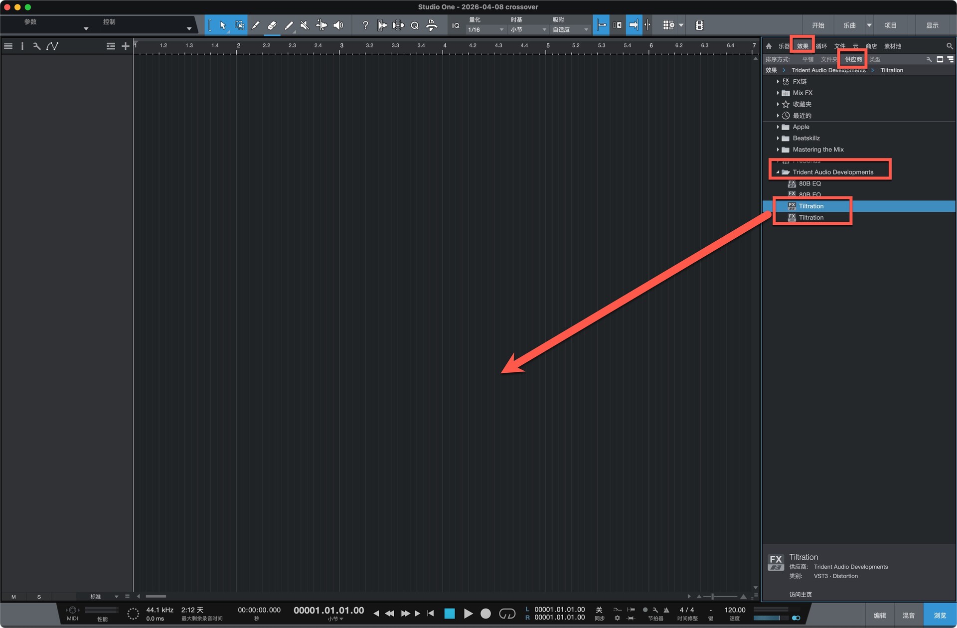 打开studio one软件,在效果-供应商中即可找打安装好的插件,拖动到左侧空白处即可使用