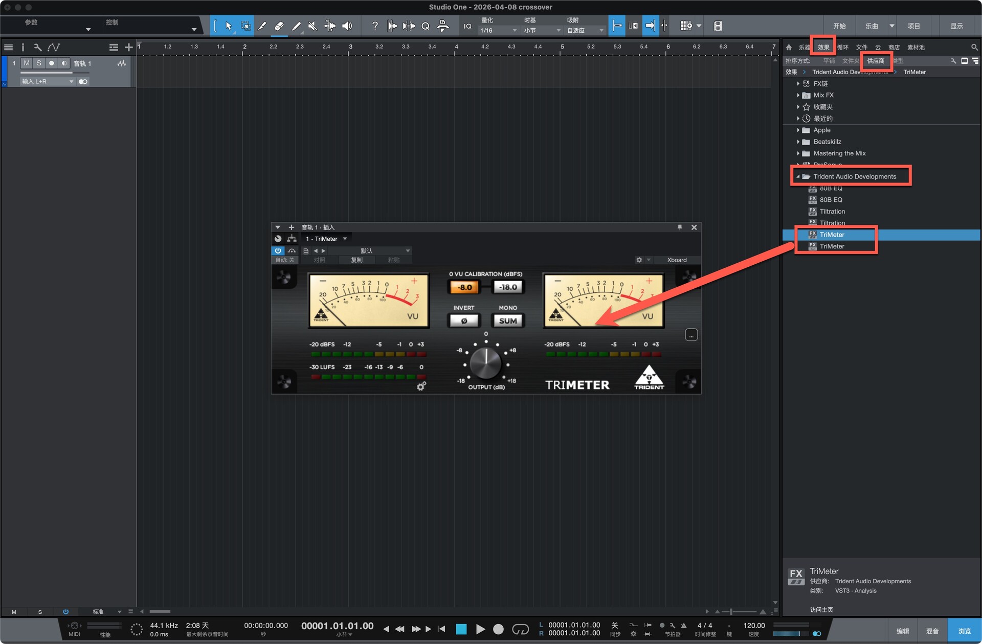 打开studio one软件,在效果-供应商中即可找打安装好的插件,拖动到左侧空白处即可使用