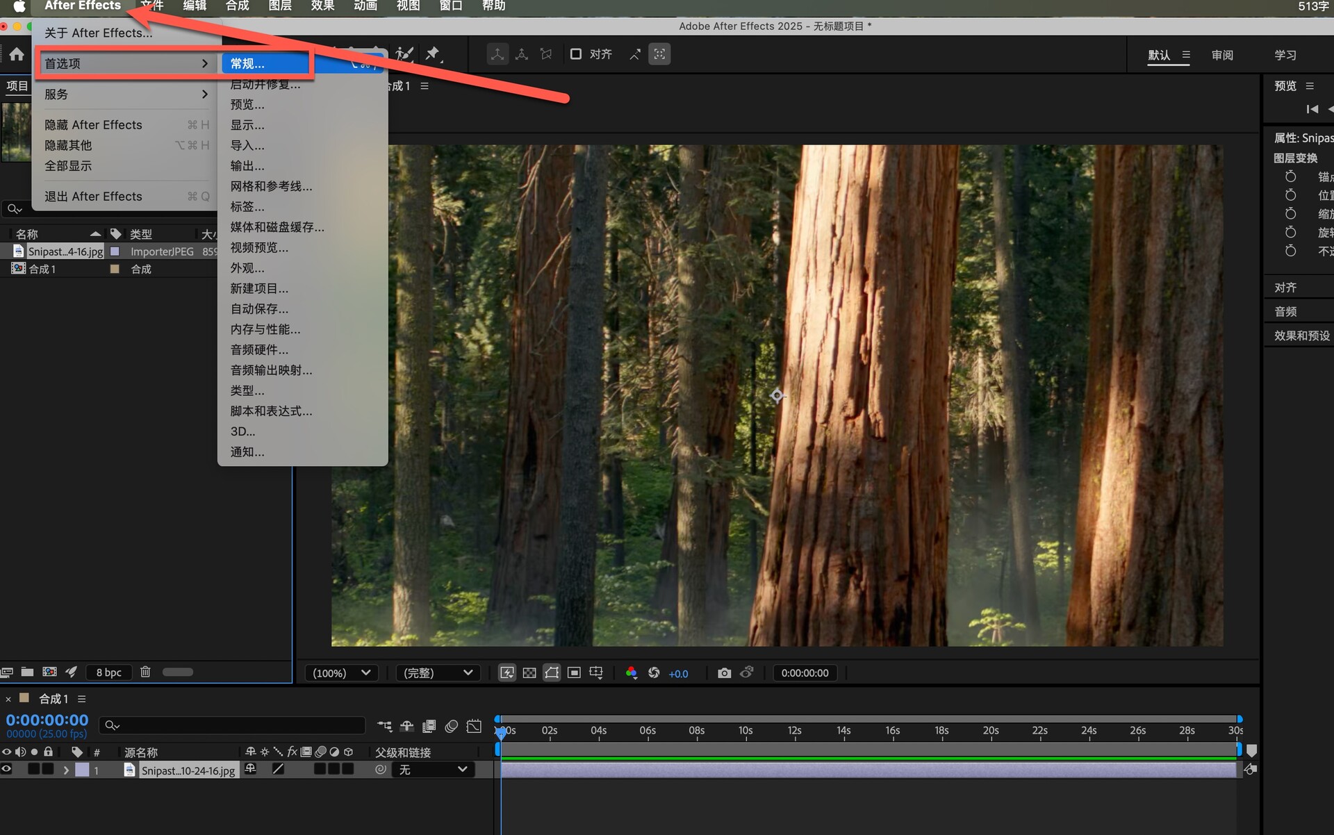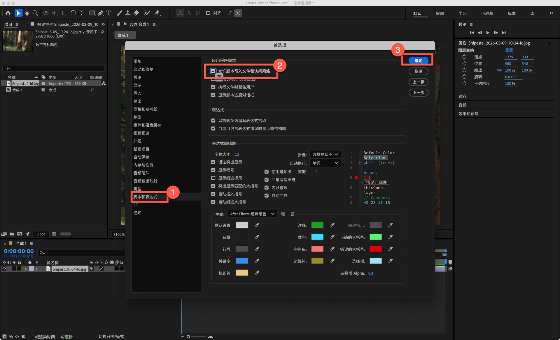 打开AE软件设置,勾选上允许脚本读写和访问网络:位置在After Effects CC-首选项-常规下,如图所示