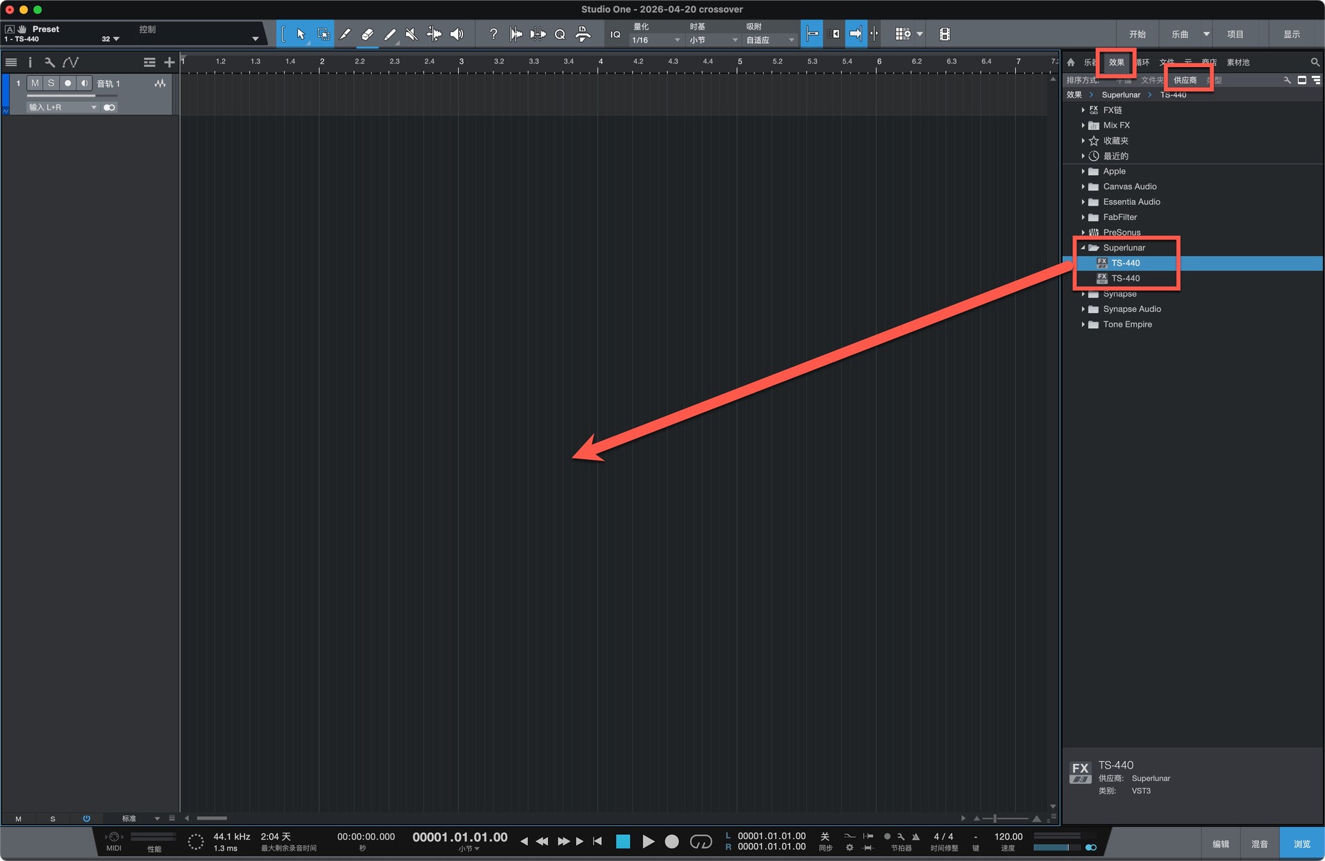 打开studio one软件,在效果-供应商中即可找打安装好的插件,拖动到左侧空白处,插件显示试用,关闭插件,这一步必须操作。