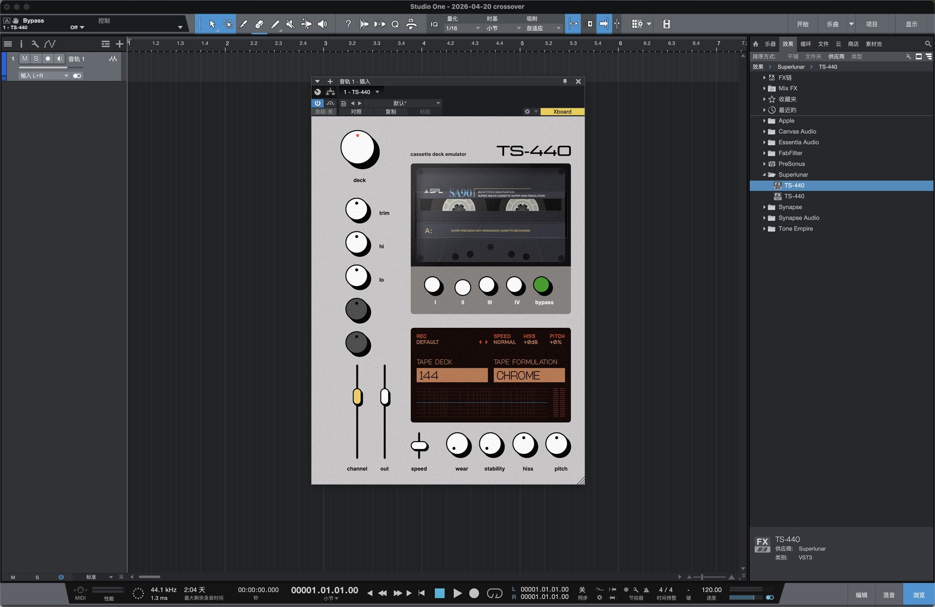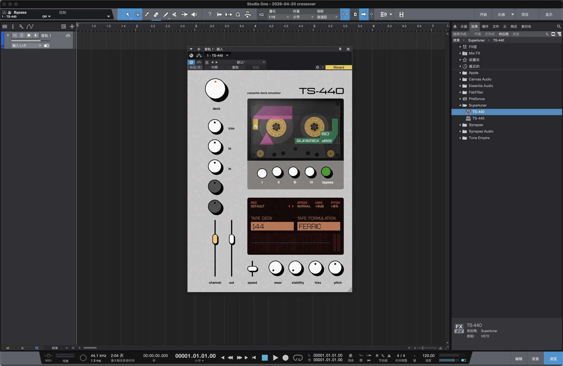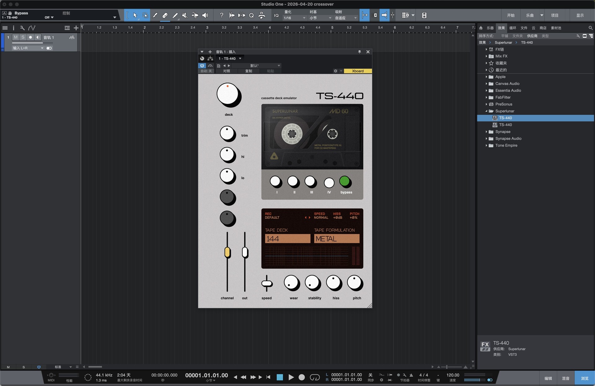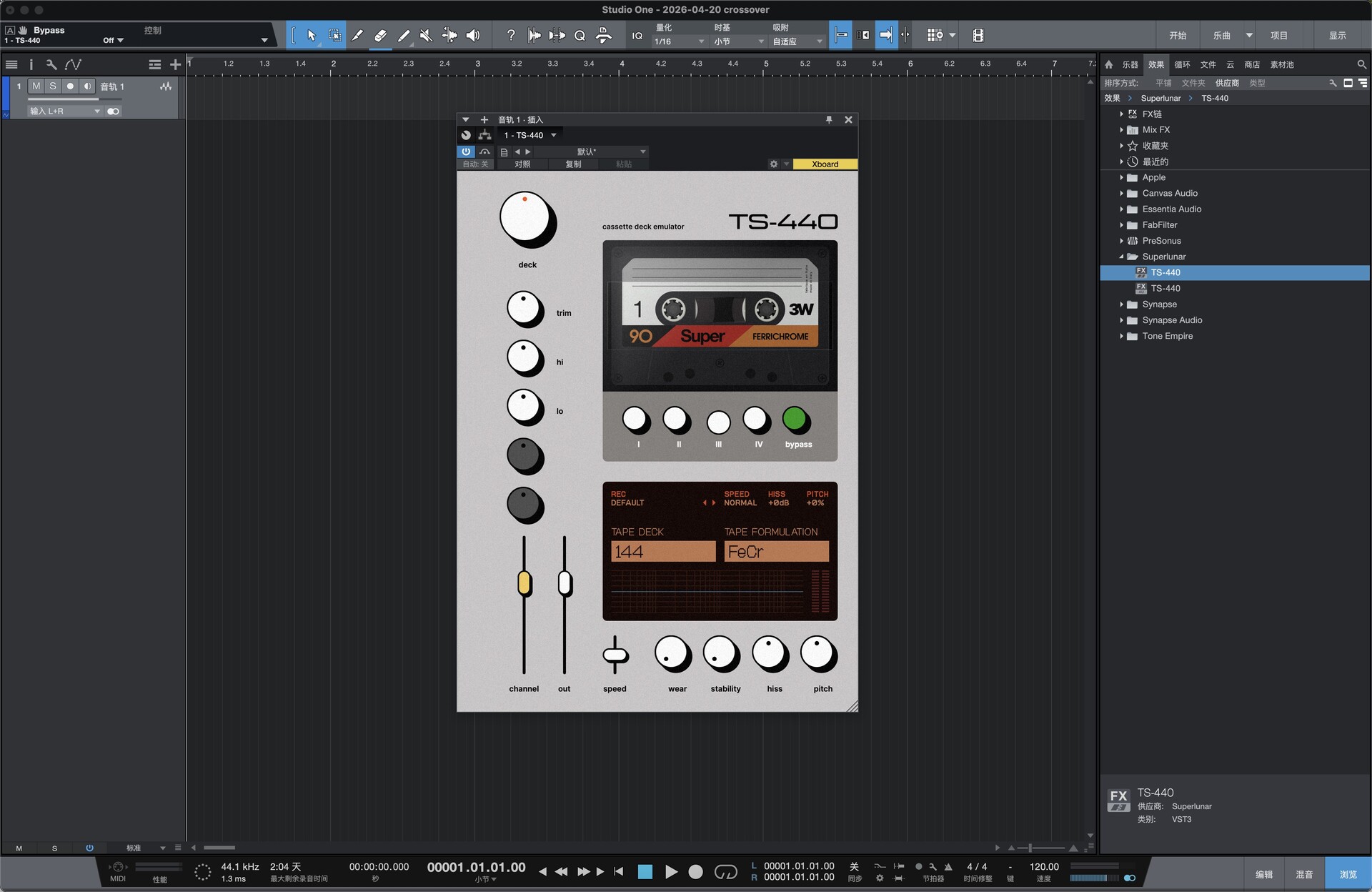 Superlunar TS-44(常称 TS-440)是一款高精度磁带机模拟器插件,精准复刻 20 台经典卡座的前级、EQ 与磁带特性,集成 4 种磁带配方(铁 / 铬 / 铁铬 / 金属)与物理劣化模拟,从温润模拟染色到低保真磁带损毁效果一键切换,是混音塑形与音色设计的全能工具。