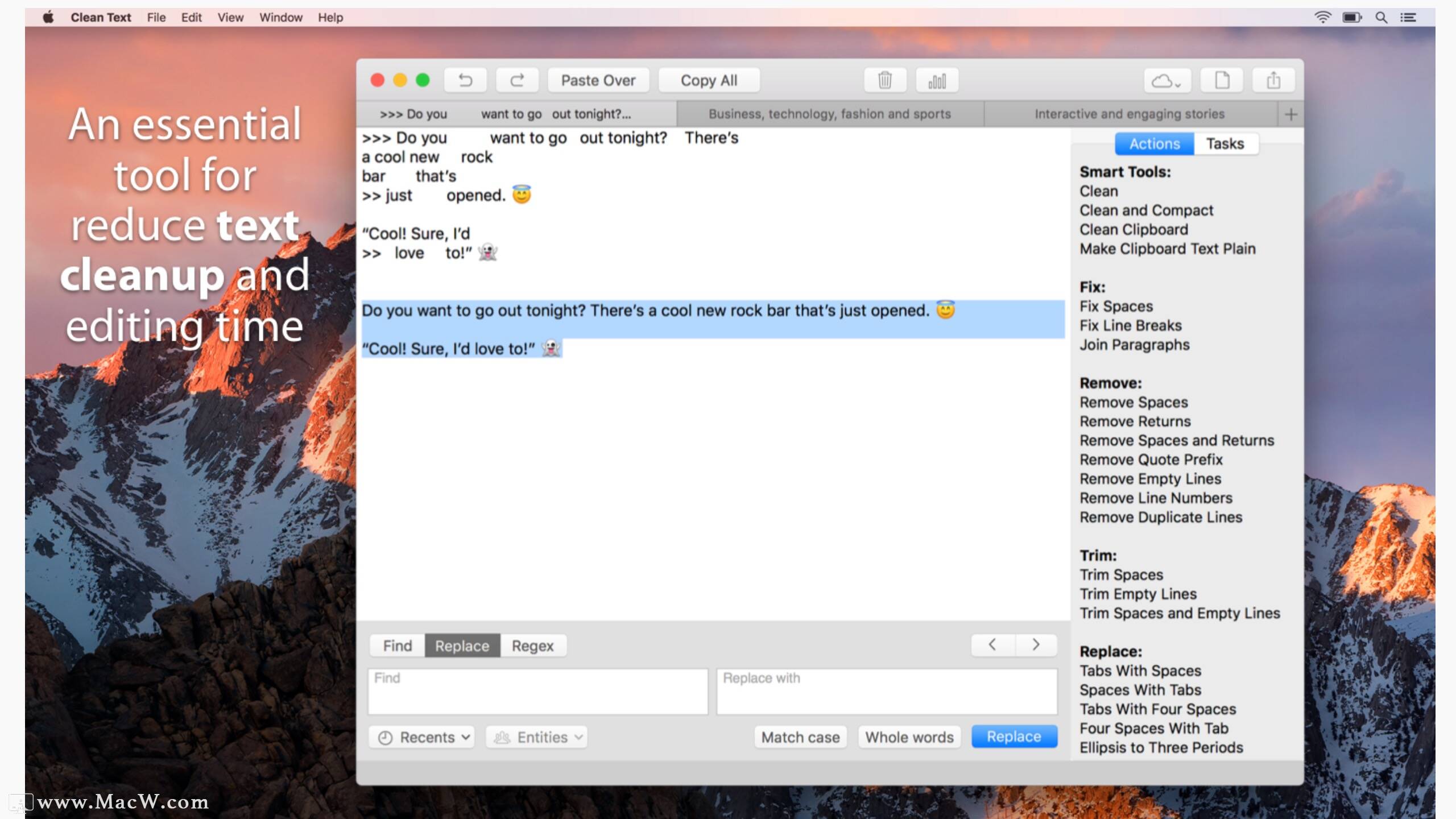 哪里可以下载文本格式清理工具?MacW为您分享clean text mac破解版,它可以帮助您快速执行许多重要的文本处理功能,例如删除空行,删除不需要的空格,转换制表符,智能引号等等。除此之外,Clean Text mac版可自定义的任务让您只需点击一下,即可在电子邮件,文档和网页中找到文本的重复和复杂清洁问题,还可以实时搜索加快搜索速度并更换工作!本站提供Clean Text下载,欢迎需要的朋友前来下载使用。