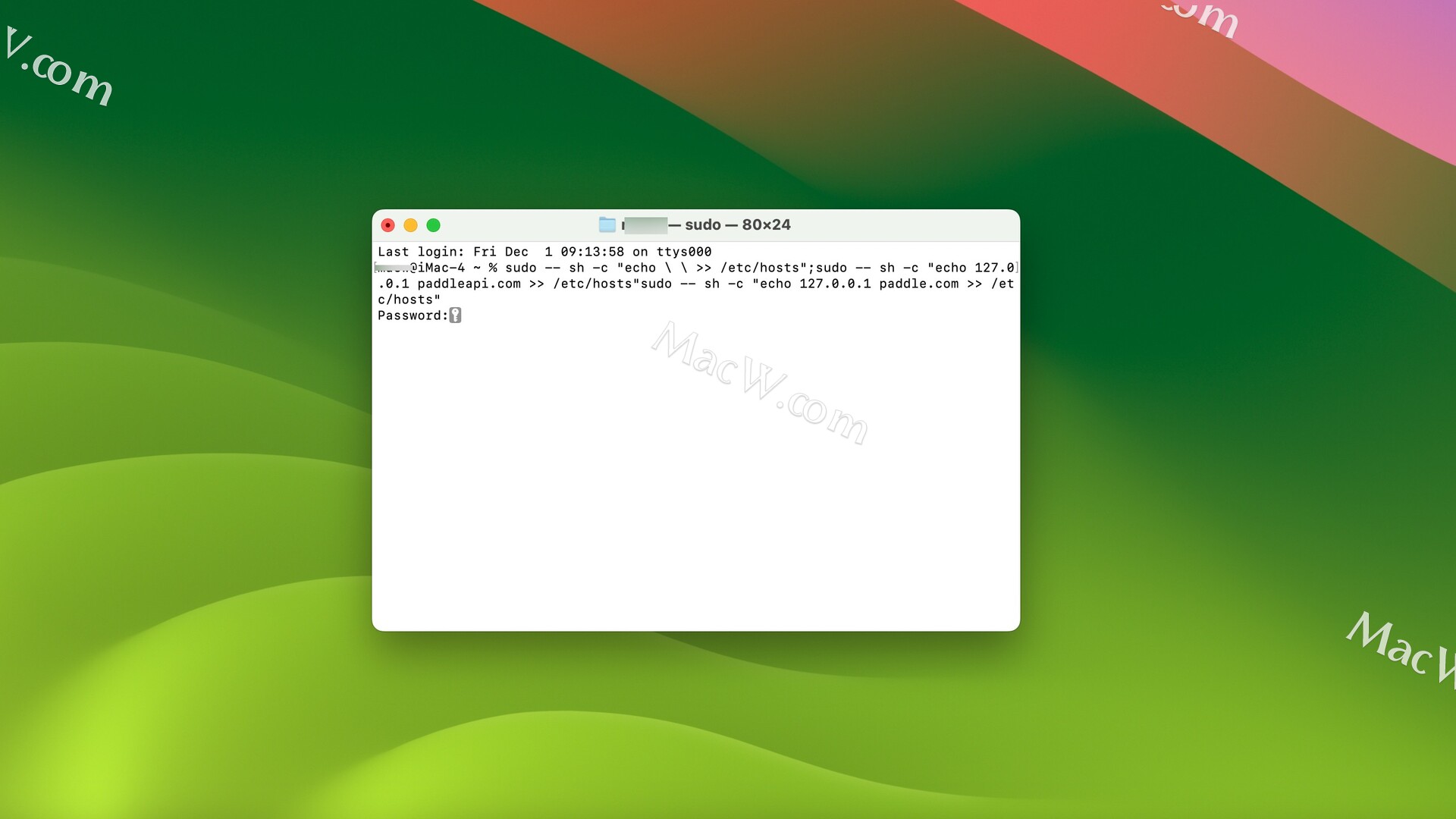 为了阻止应用程序连接到Paddle的服务器,首先打开终端,复制以下代码到终端回车后输入密码等待运行完成即可