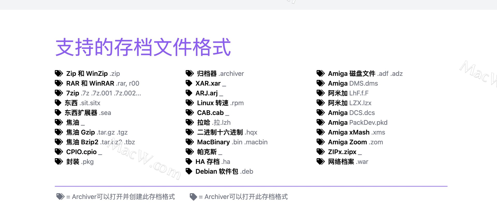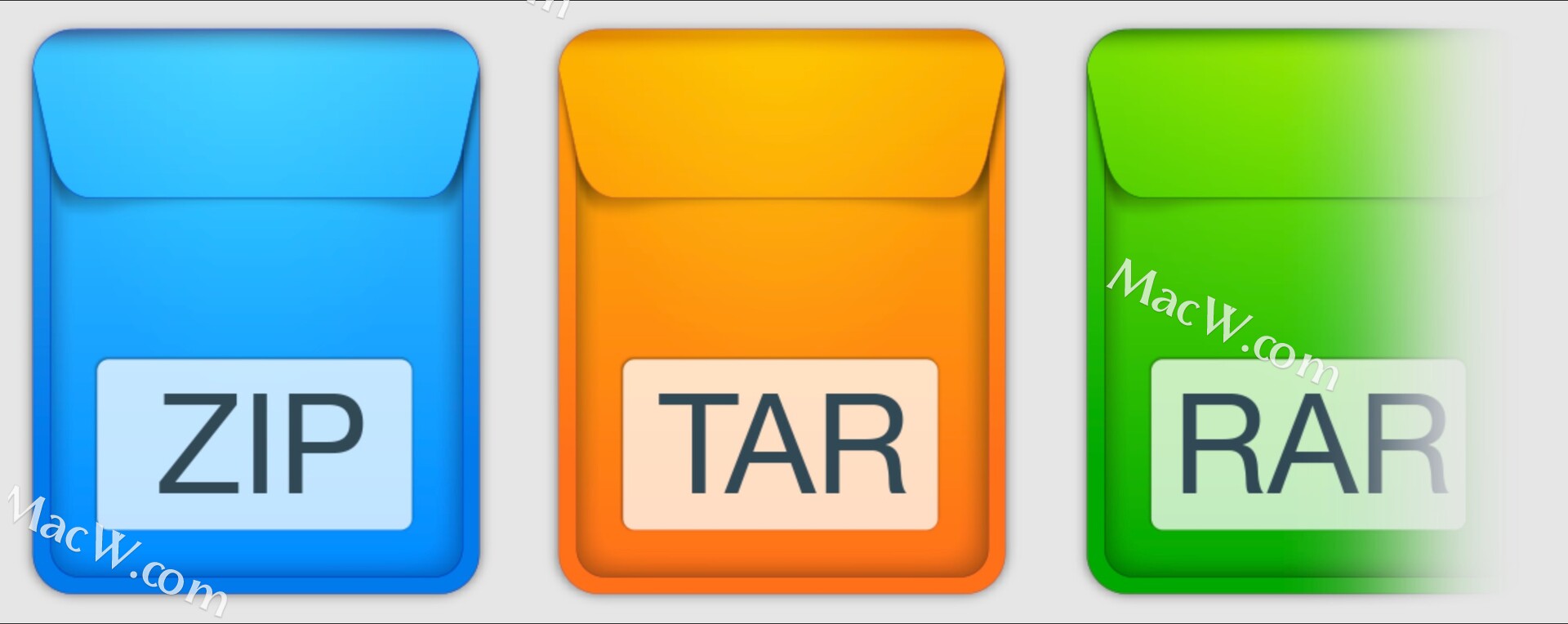 一系列三种颜色的图标代表 Archiver 可以使用的不同格式:“ZIP”、“TAR”、“RAR”...