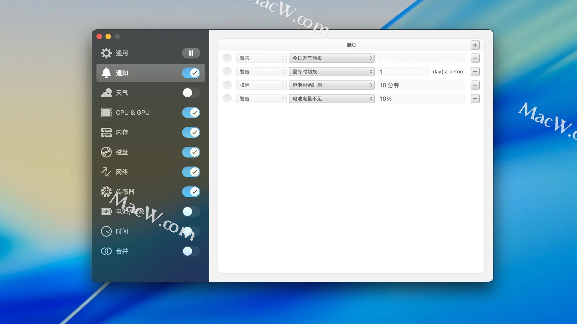 基于CPU,GPU,内存,磁盘,网络,传感器,电池,电量和天气,iStat菜单可以通知您一系列令人难以置信的事件。这可以让您在公共IP发生更改,互联网连接断开,CPU使用率超过60%超过10秒或其他选项范围接近无限时通知您。它甚至可以让你知道当天的天气,或者提醒你夏时制的变化。