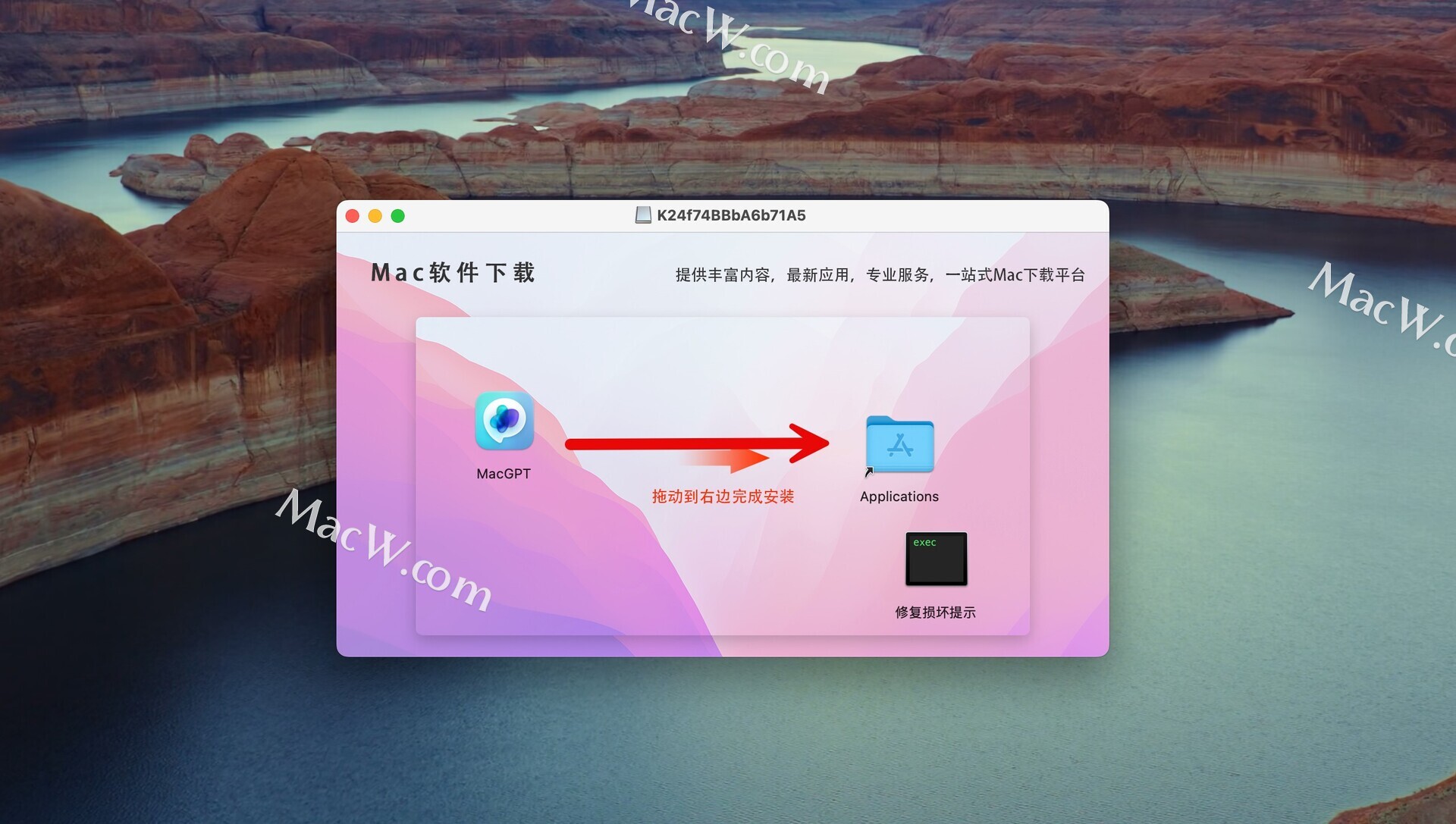 下载完成后,打开安装包,将左侧的软件拖动到右侧应用程序即可。