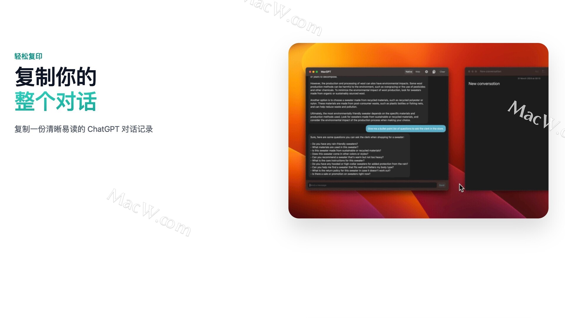 - 对话内容一键复制:MacGPT支持一键复制与ChatGPT的所有对话内容,方便用户随时保存或分享重要信息。
