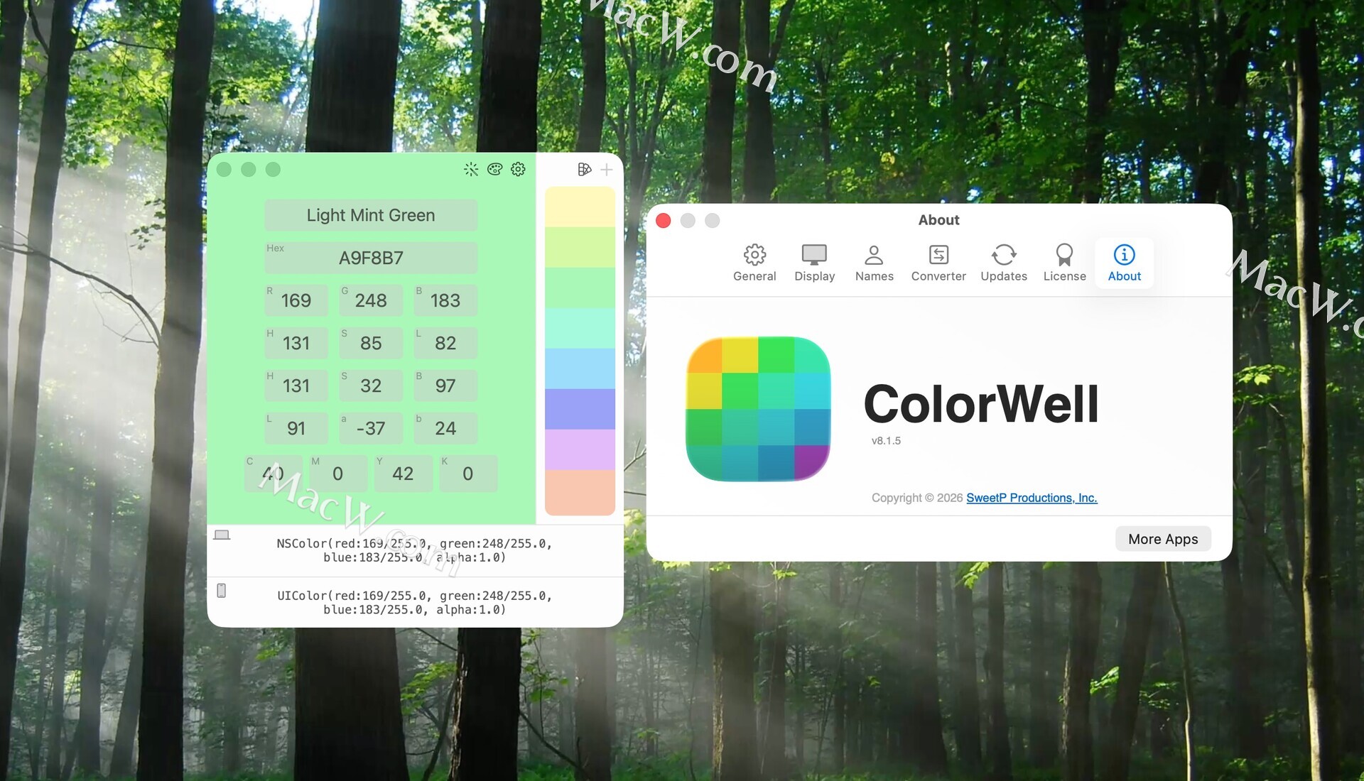 除此之外,ColorWell还支持调整色彩的亮度、饱和度以及对比度等参数,满足用户的多样化需求。它还支持导出颜色板和调色板、历史纪录功能等,非常适合网页设计师、图形设计师和开发人员使用。测试环境:MacOS 26.2