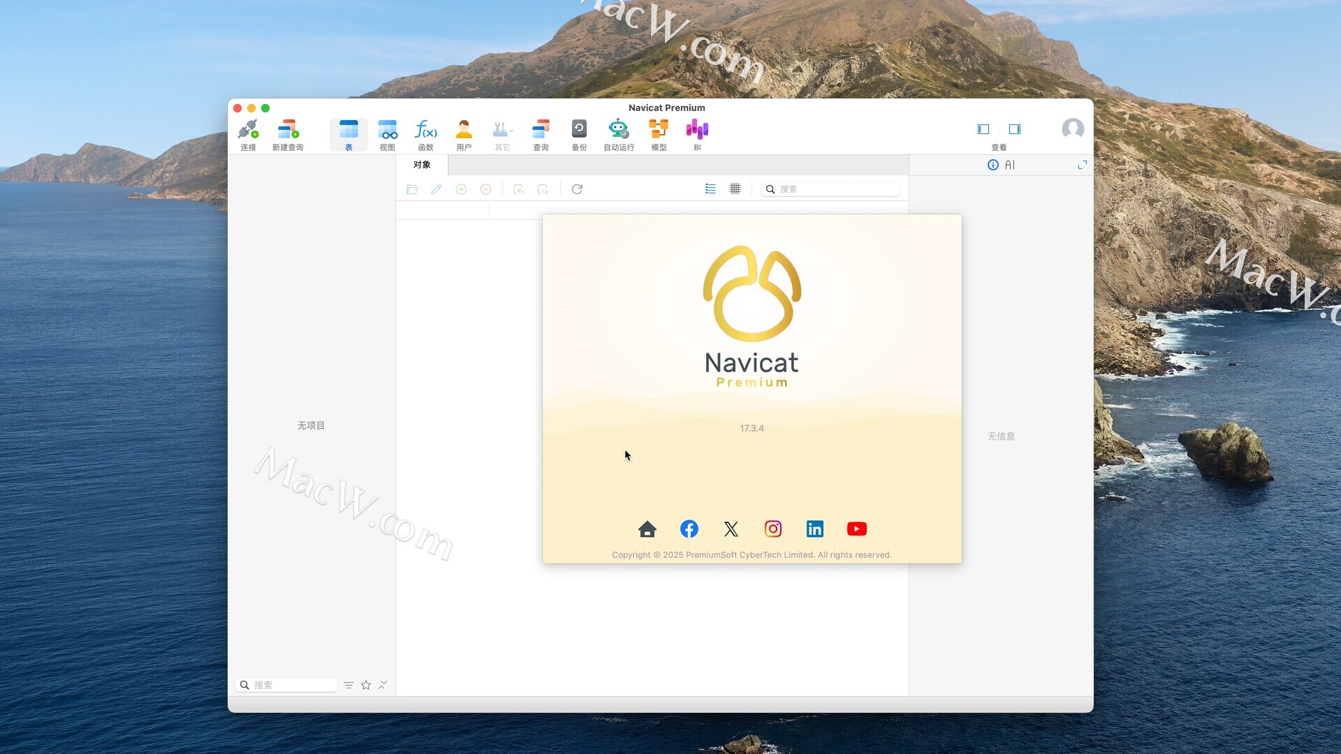Navicat Premium for Mac是一款专业的数据库管理工具,适用于开发人员、数据库管理员和分析师等用户。它提供了强大的数据管理功能和丰富的工具,使用户能够轻松地管理和维护数据库,提高数据处理效率。测试环境:MacOS 13.7.6