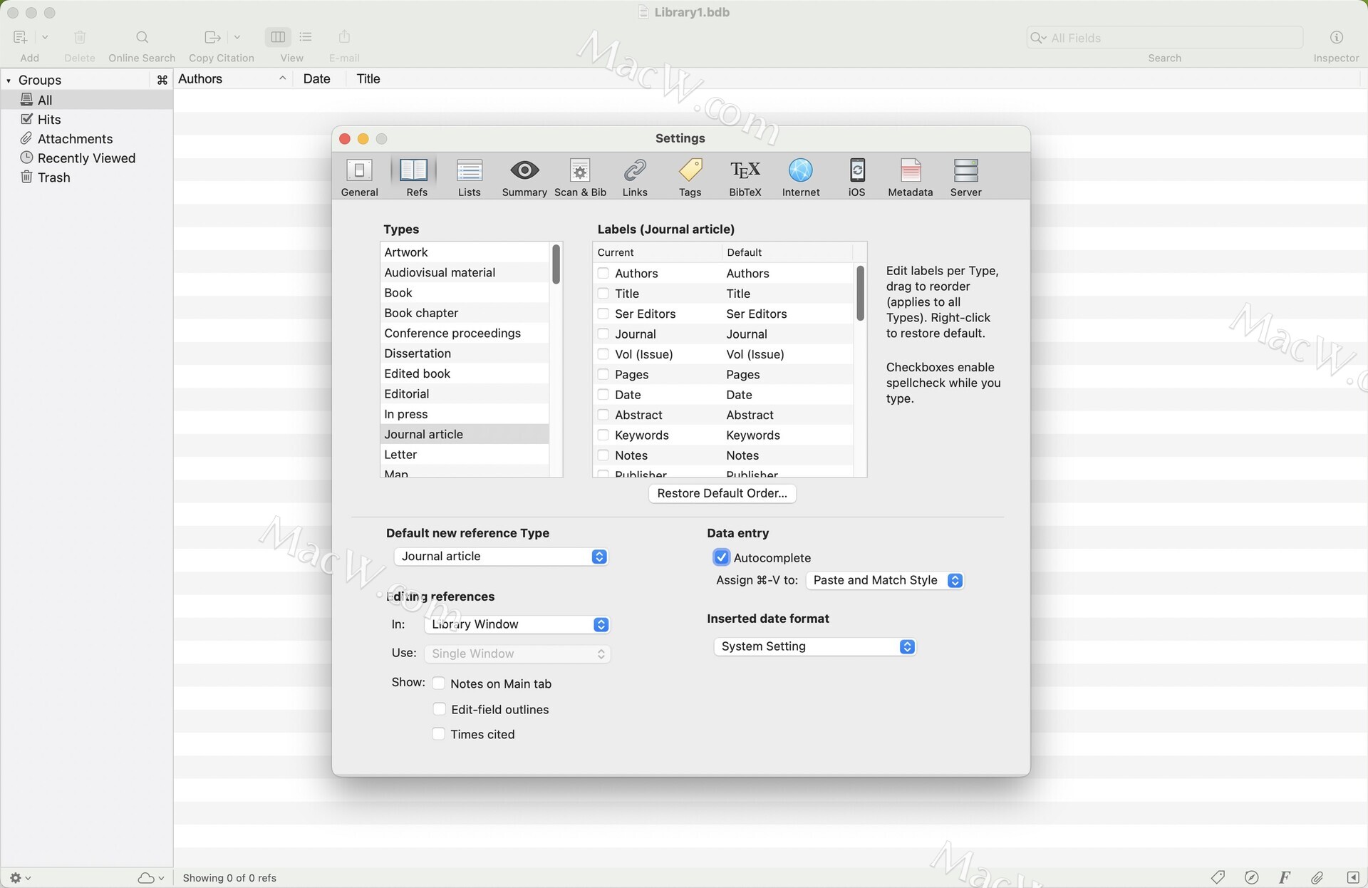 输入和/或编辑参考元数据(例如作者,标题,注释等)。