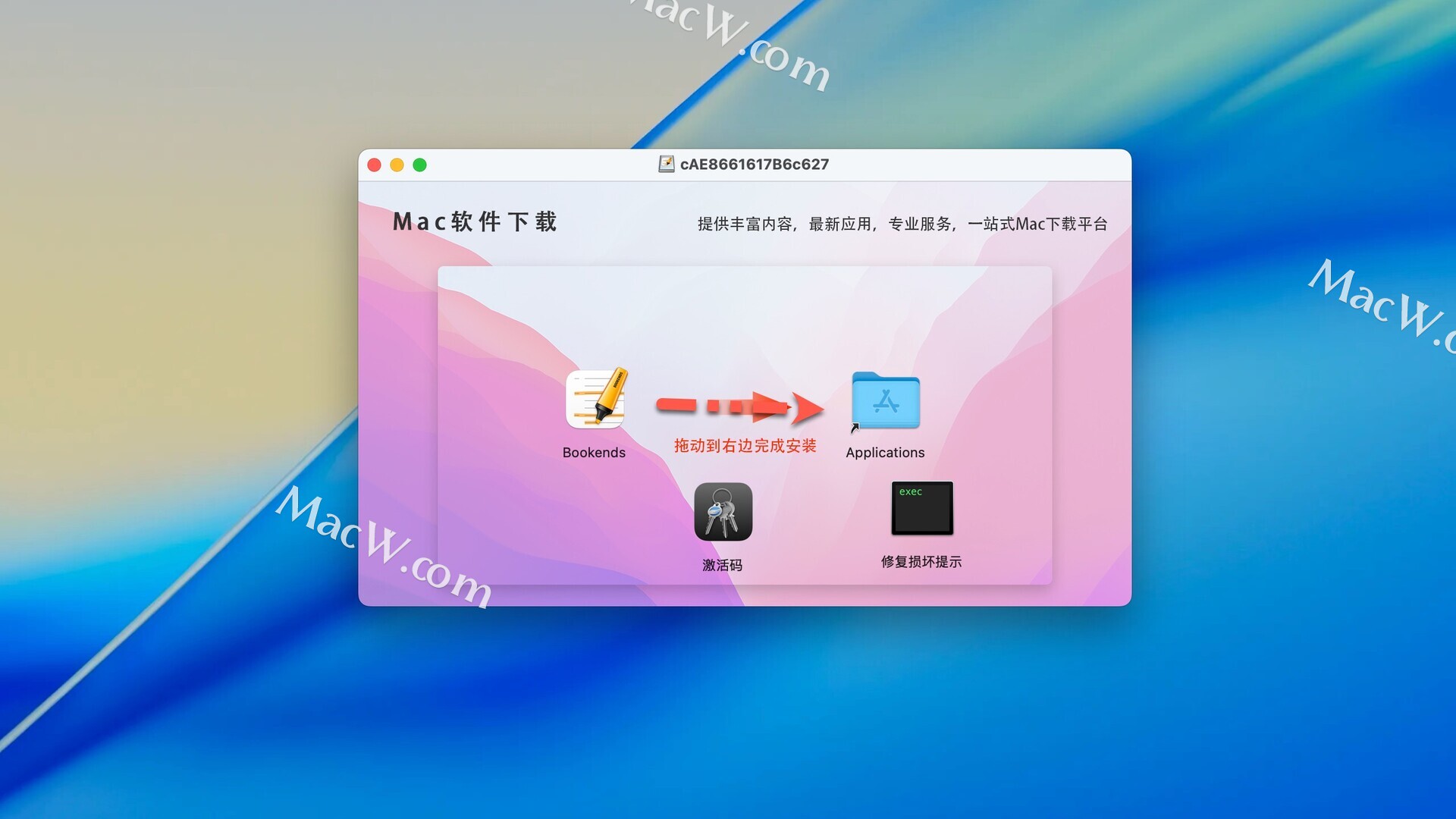 Bookends拖拽至右侧Applicatios应用程序中进行安装,等待静默安装完毕即可。