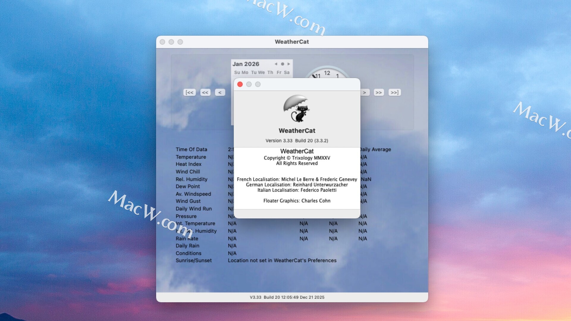 WeatherCat 是适用于 Macintosh 计算机的气象站软件。WeatherCat 旨在与以下基于硬件的气象站配合使用: