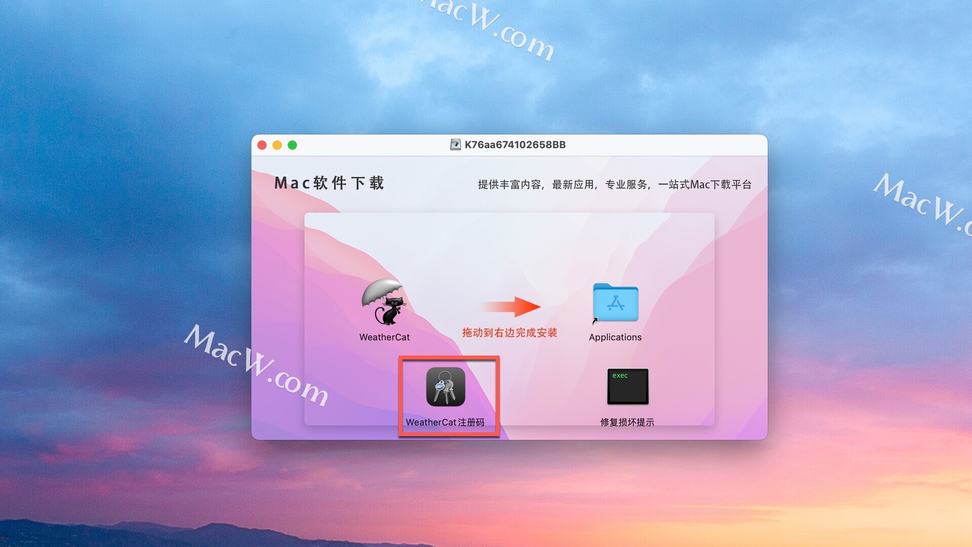 安装包下载完成后打开,拖动左侧的WeatherCat到右侧应用程序中即可