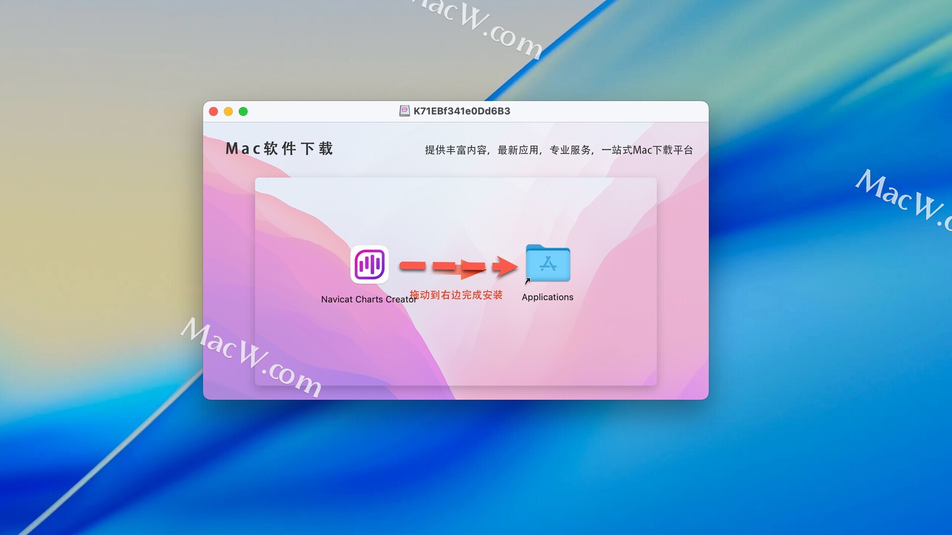 安装包下载完成后打开,拖动左侧的Navicat Charts Creator到右侧应用程序中即可