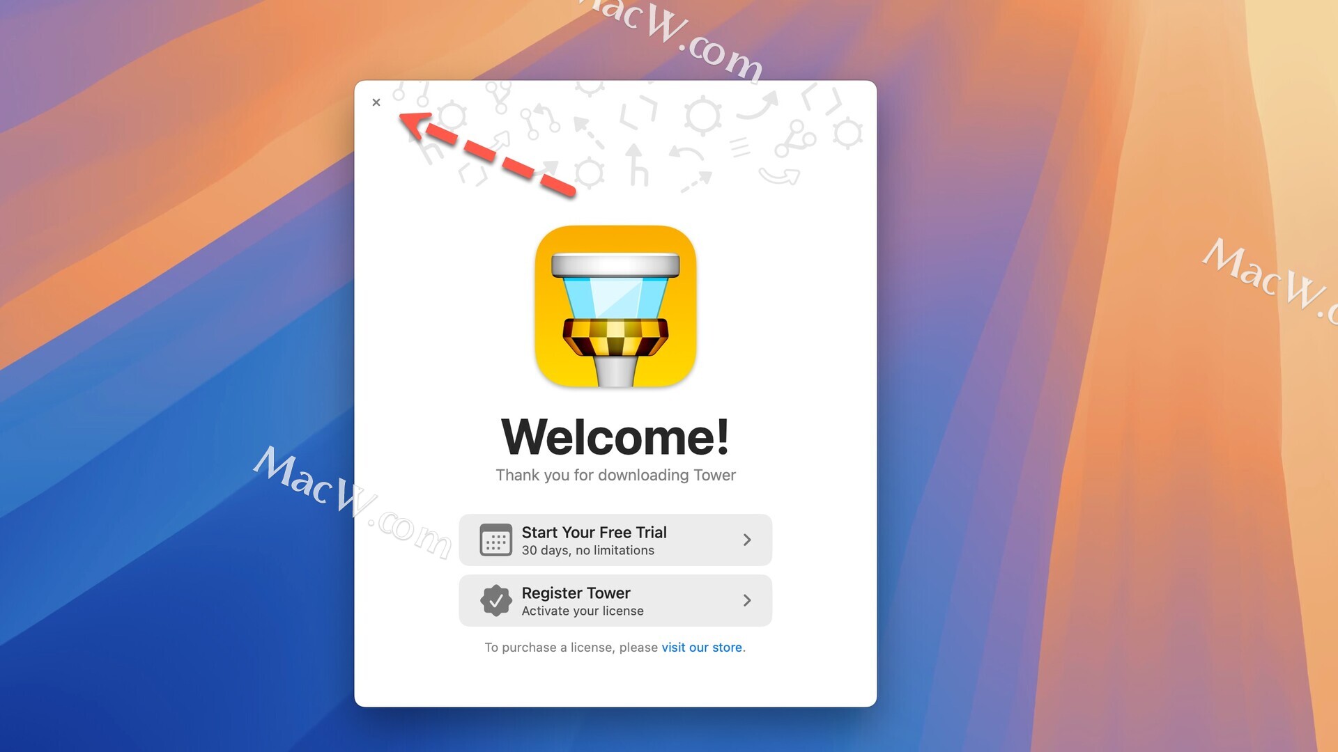 打开Tower,会弹出welcome窗口,关闭即可。注意!一定要关闭软件!