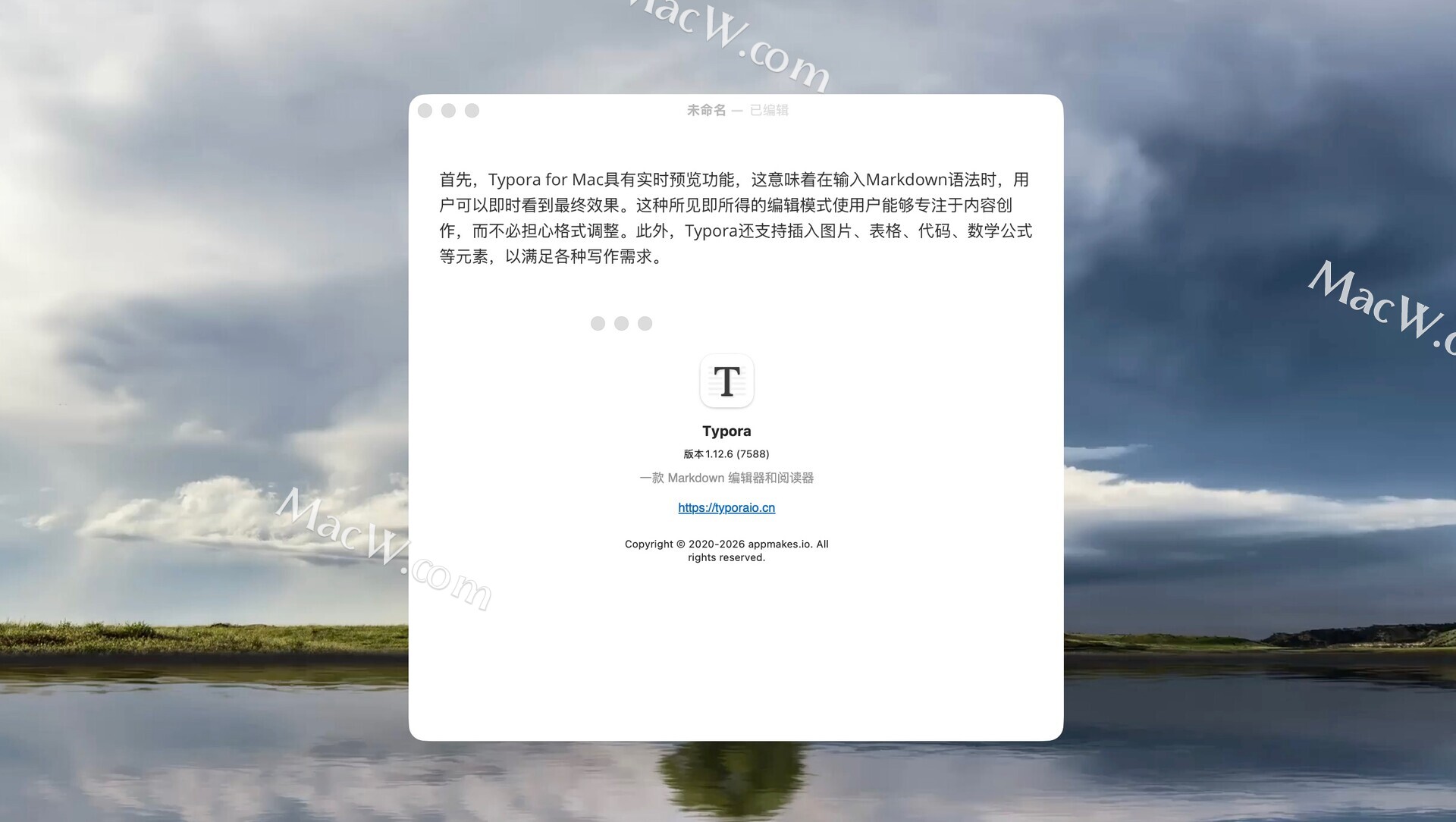 总之,Typora for Mac是一款功能丰富、界面简洁优雅的Markdown编辑器,适用于写作、笔记、博客等多种场景。使用Typora可以提高写作效率和体验,是Mac用户进行Markdown文档编辑的理想选择。测试环境:MacOS 26.2