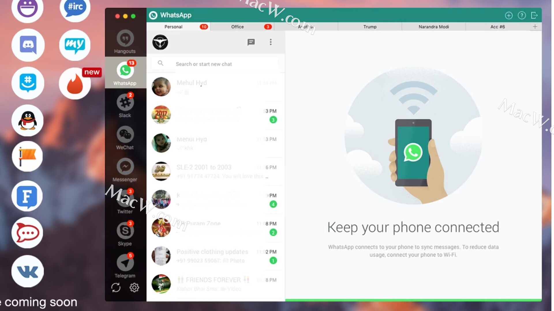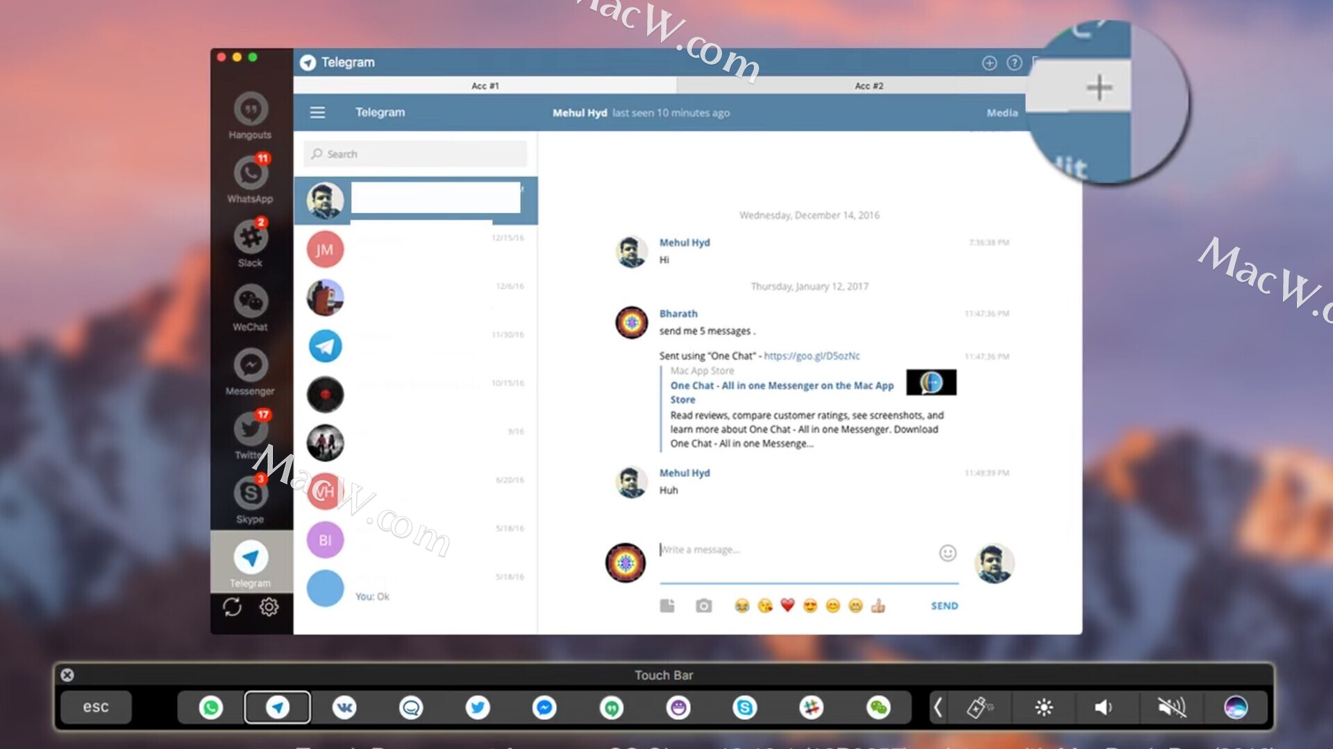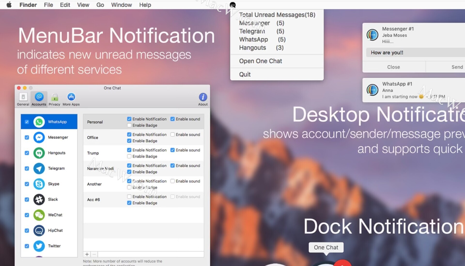One Chat for Mac版,一款适用于所有消息服务的应用程序。将其用于以下信使并像老板一样聊天:- WhatsApp、Facebook Messenger、Hangouts、Telegram、Skype、Slack、微信、Twitter、YahooChat、ICQ 聊天、HipChat、Discord、GroupMe、QQ、Facebook Page Messenger VK、Fleep、 RocketChat、MySMS、IRC 聊天、TweetDeck Tinder。