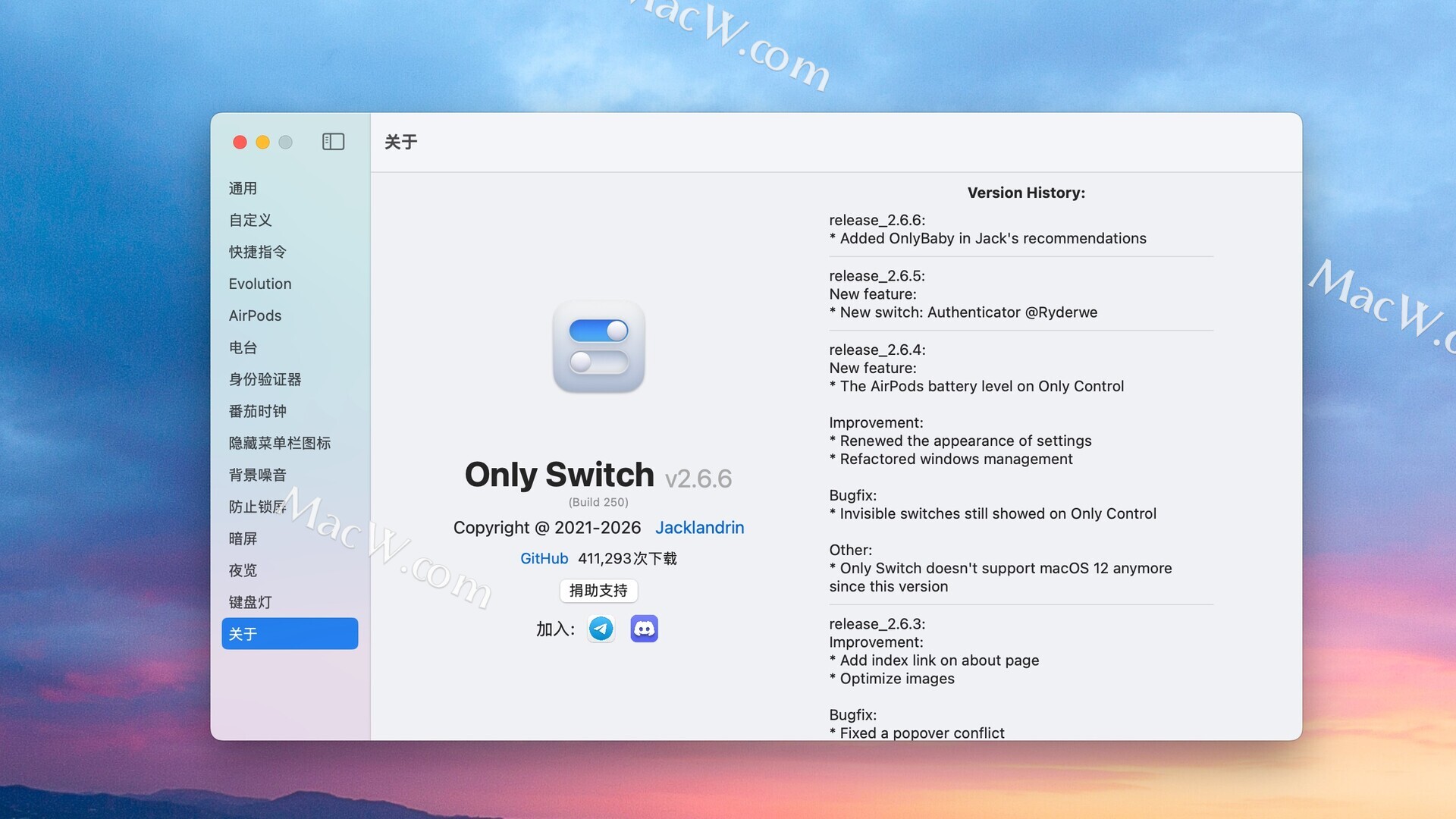 Only Switch是一款专为Mac用户设计的软件,可以在菜单栏一键控制系统功能。它包含多种功能,如隐藏桌面、切换黑暗模式、保持亮屏、屏幕保护和AirPods连接。这款软件方便快捷,只需点击一下即可开启各种功能,未来还会开发更多功能。测试环境:MacOS 15.7