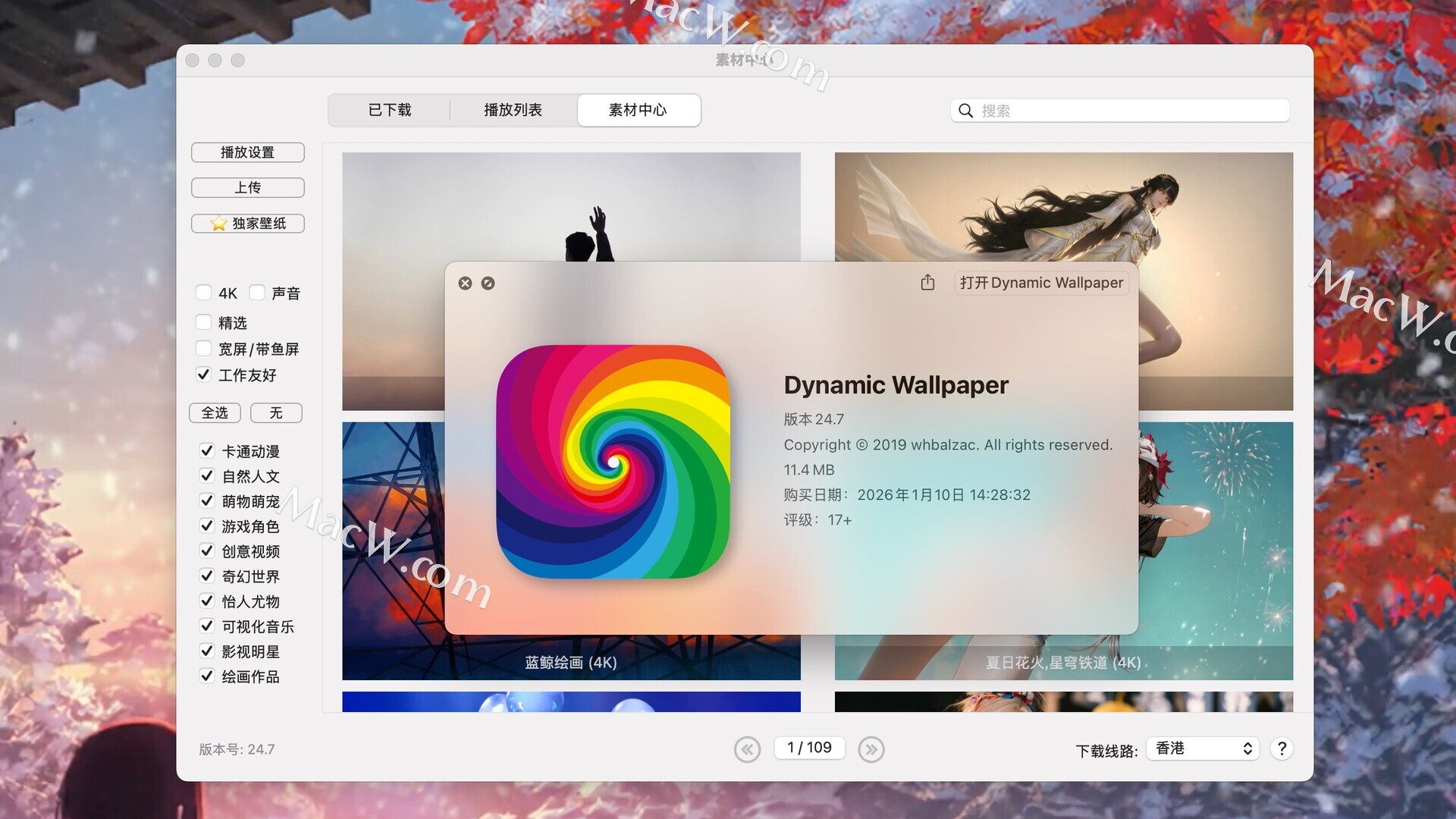 总之,Dynamic Wallpaper是一款功能强大、易于使用的Mac壁纸应用程序,它可以让用户的桌面壁纸变得更加生动和有趣。它提供了多个预设的动态壁纸和自定义选项,适用于各种场景和个人喜好。测试环境:MacOS 26.6